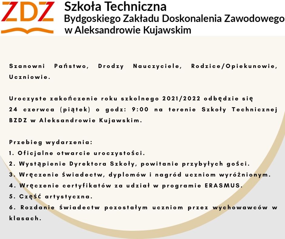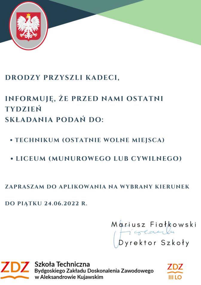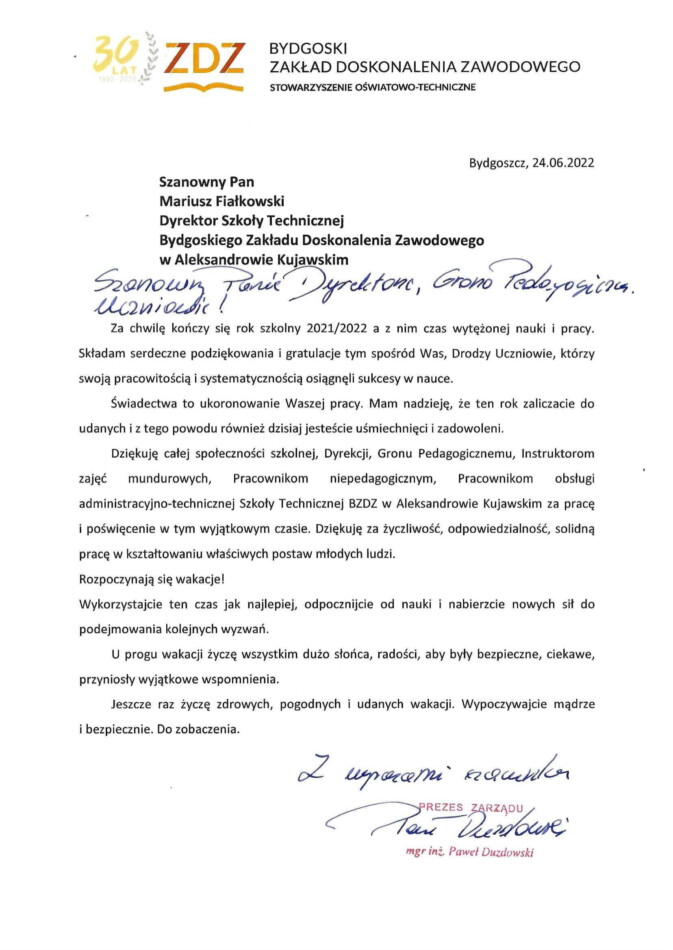 Dyrektor Mariusz Fiałkowski wygłosił okolicznościowe przemówienie oraz odczytał list Prezesa Bydgoskiego Zakładu Doskonalenia Zawodowego – Pawła Duzdowskiego skierowane do całej szkolnej społeczności.