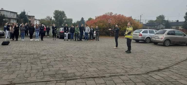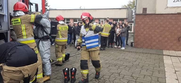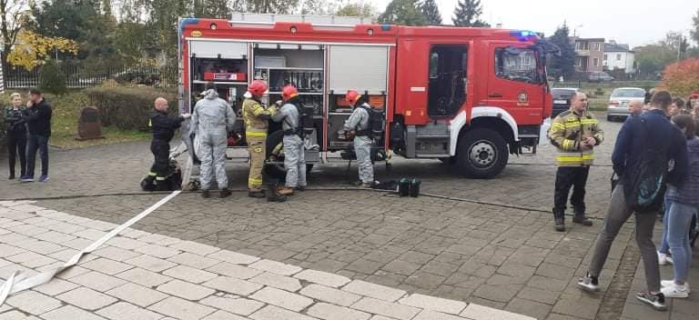 Po akcji ewakuacyjnej uczniowie mogli przyglądać się działaniom starażaków.