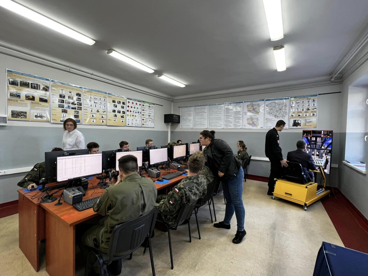 Ważnym wyposażeniem sali jest symulator wózka widłowego. Trenujący, siedząc w fotelu operatora, mogą korzystać z kierownicy, kontrolerów i dźwigni zmiany biegów. W ustawieniach oprogramowania można modyfikować warunki treningu, zarówno plac, po którym porusza się wózek, jak i pogodę.