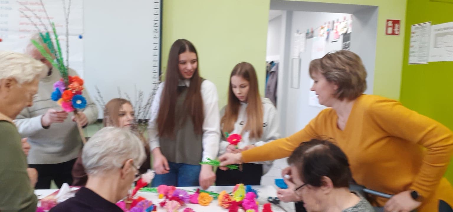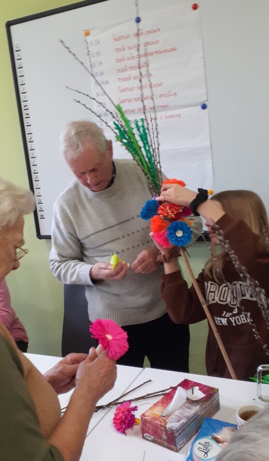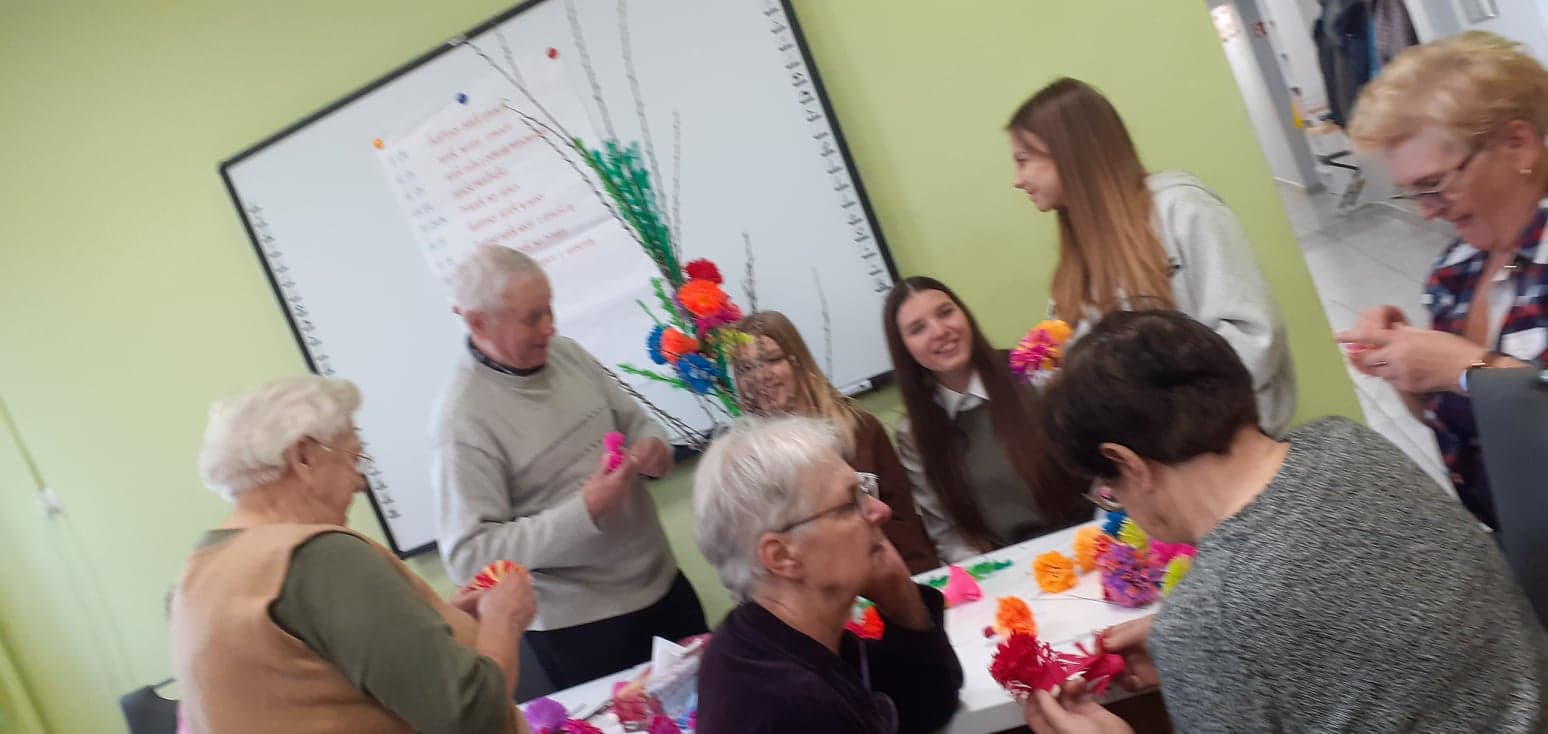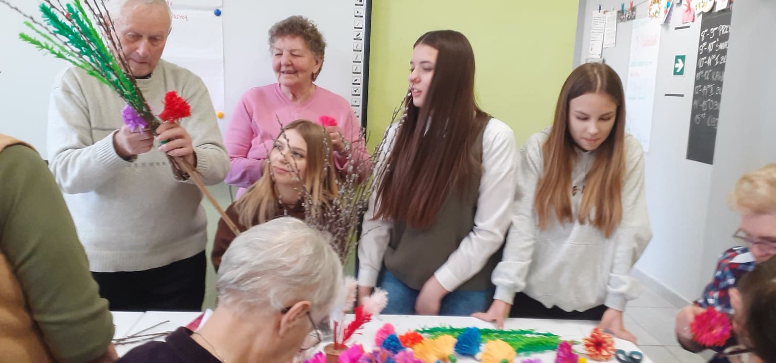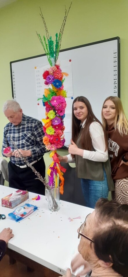 Młodzież przywitała gospodarzy wiosennymi kwiatkami, była wspaniała ciepła atmosfera oraz nuta rywalizacji (!) Dlaczego? PONIEWAŻ wspólnie z uczestnikami DDP połączeni grupy robiliśmy NAJPIĘKNIEJSZE wielkanocne palmy :) ! A ta największa miała oczywiście WYGRAĆ!