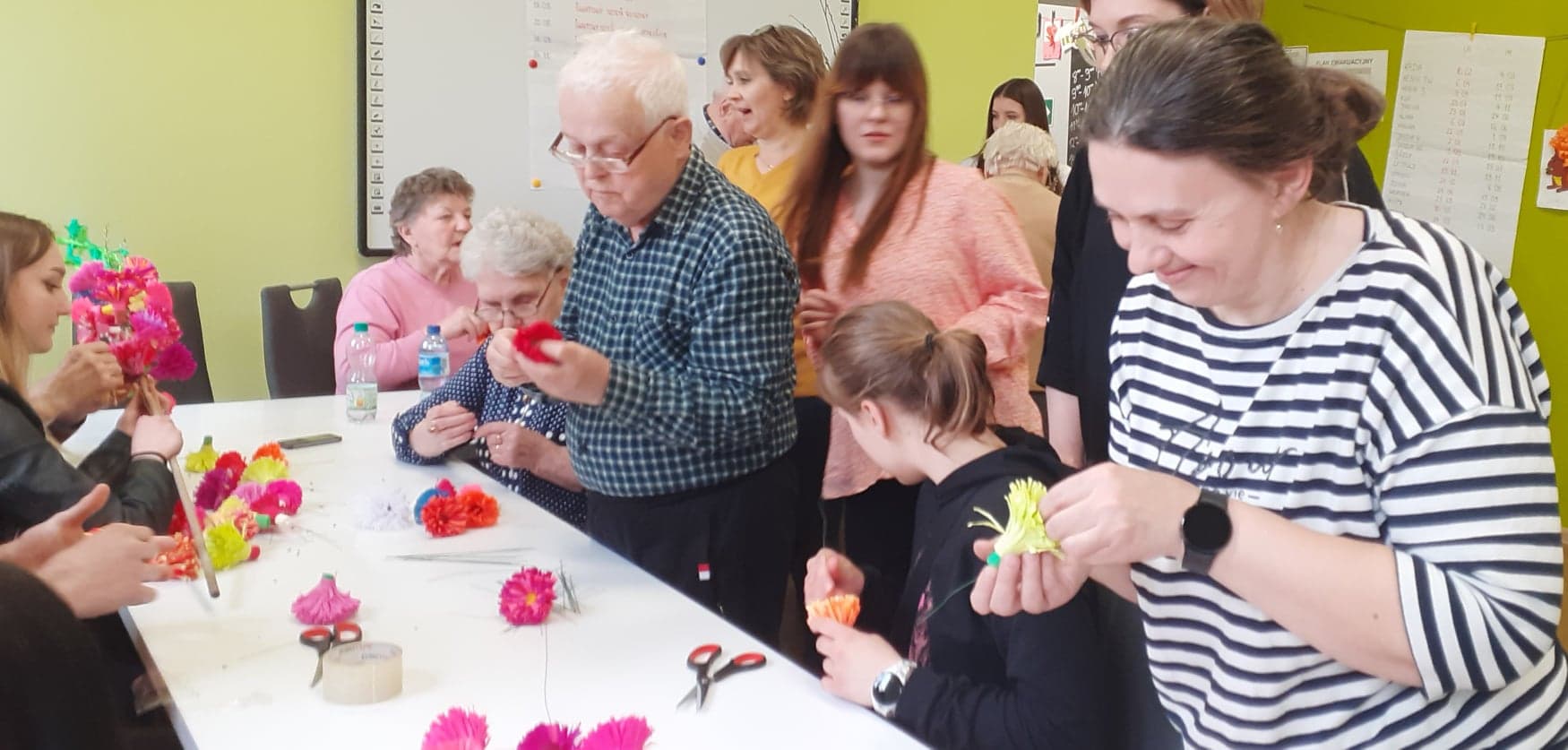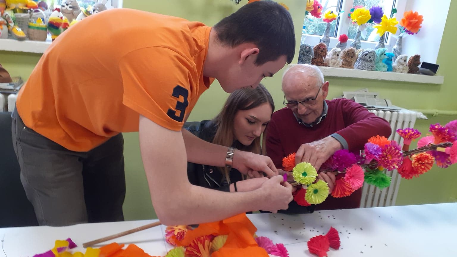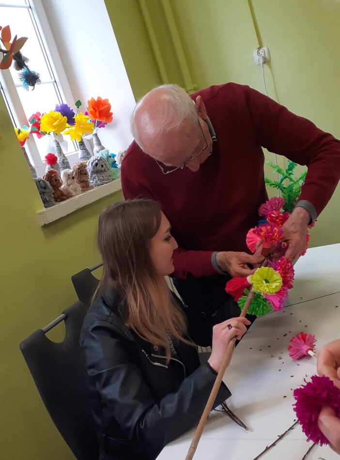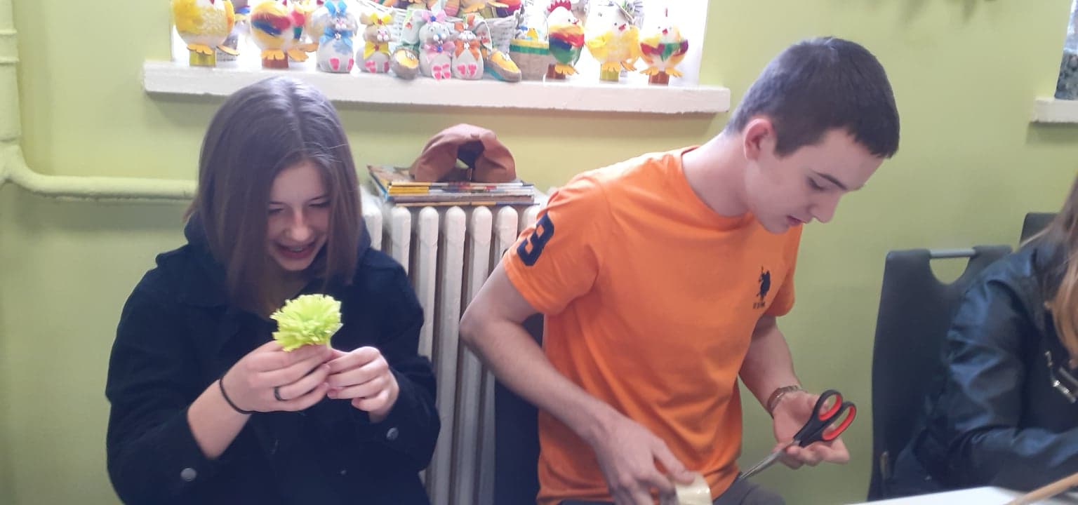 Młodzież przywitała gospodarzy wiosennymi kwiatkami, była wspaniała ciepła atmosfera oraz nuta rywalizacji (!) Dlaczego? PONIEWAŻ wspólnie z uczestnikami DDP połączeni grupy robiliśmy NAJPIĘKNIEJSZE wielkanocne palmy :) ! A ta największa miała oczywiście WYGRAĆ!