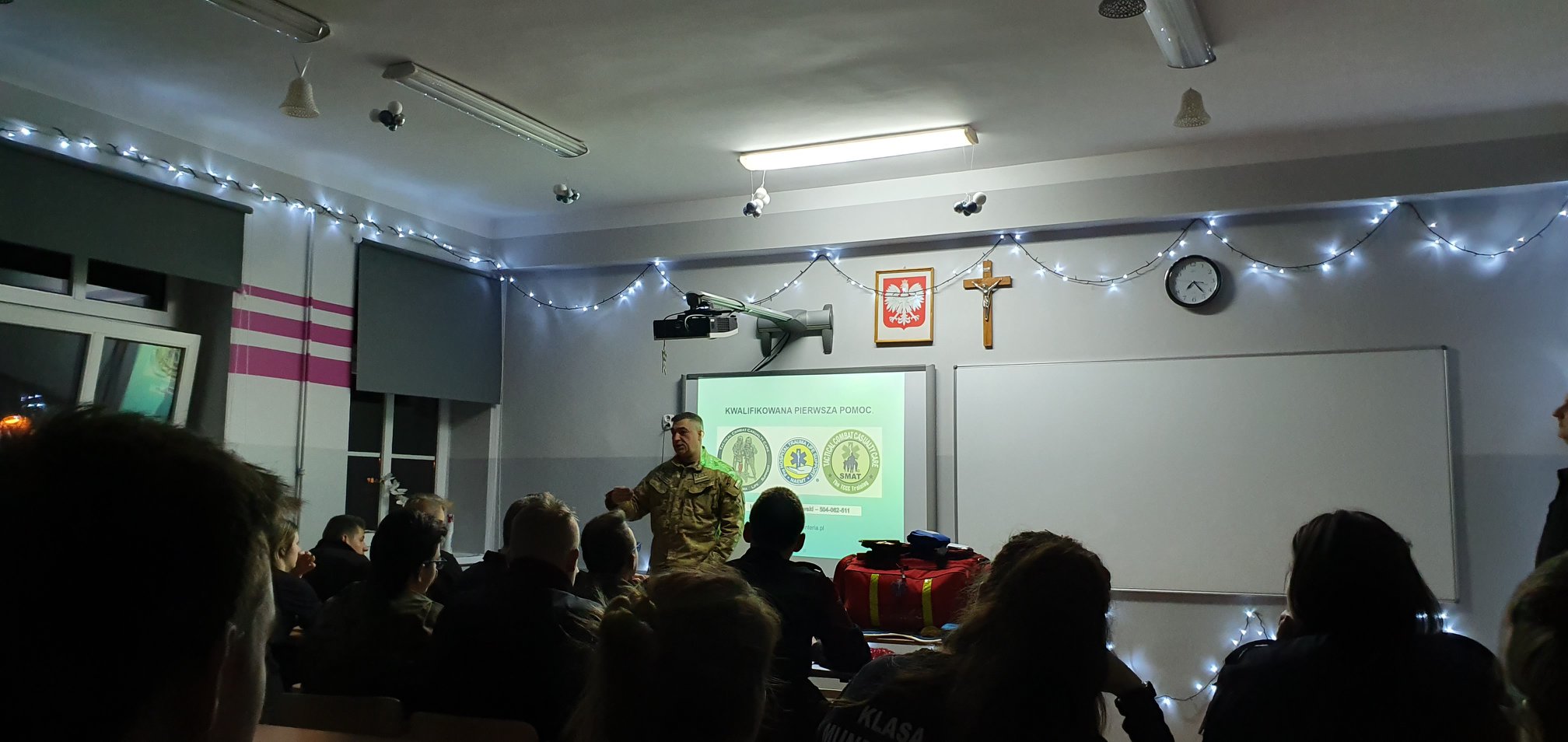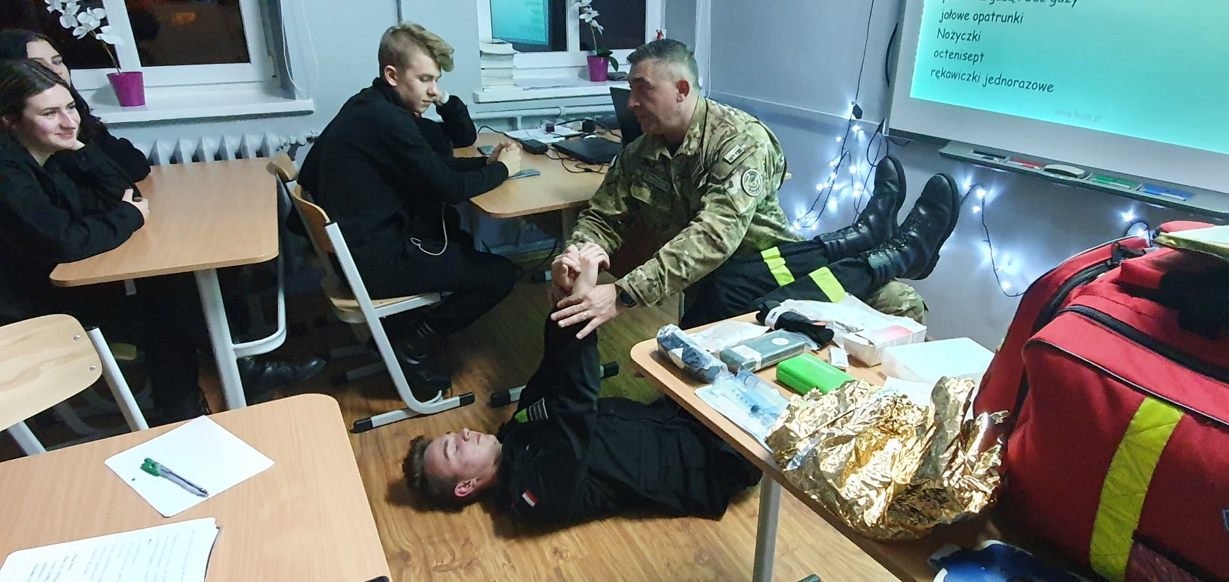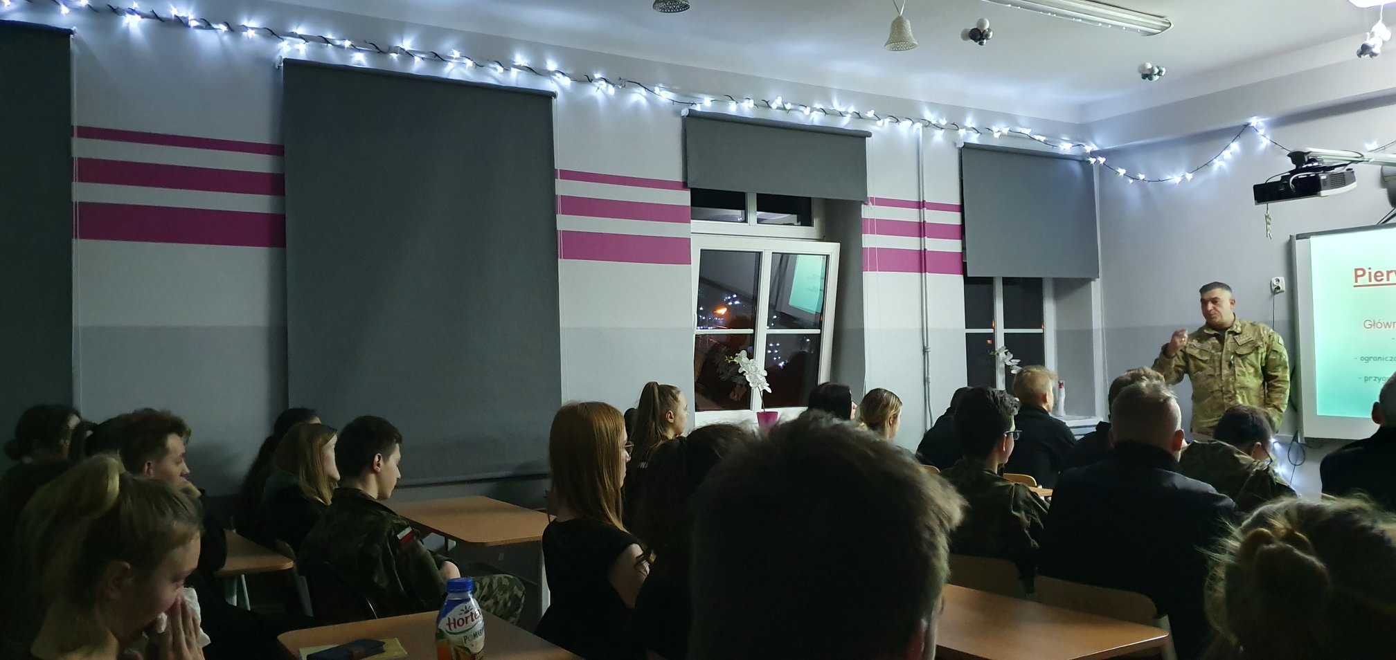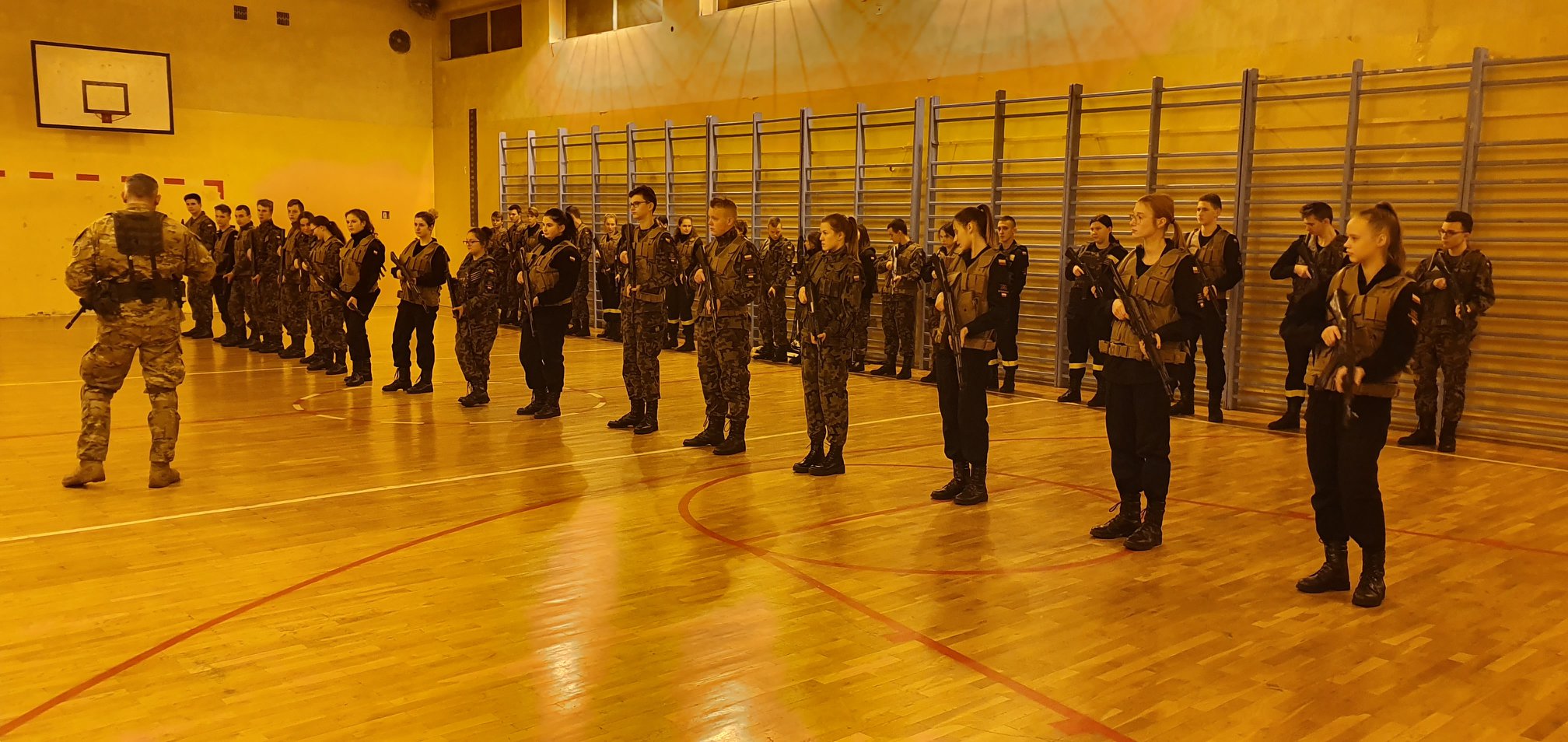 W dniu 13.12.2019r odbyły się zajęcia dzienno nocne dla uczniów klas I na których zrealizowano szereg zajęć ze szkolenia medycznego, taktyki, strzeleckiego i musztry. Na zajęciach ze szkolenia medycznego uczniowie zapoznani zostali z wyposażeniem torby medycznej PSPR1 oraz IMPED, mieli okazję zobaczyć i sprawdzić działanie opatrunków osobistych, staz, kołnierzy ortopedycznych, strzykawek do odsysania jadu i wielu innych. Uczniowie nauczyli się postępowania na wypadek omdleń, zakrztuszeń, złamań, tamowania ran, poparzeń, porażenia prądem itd. Podczas zajęć z taktyki ćwiczyliśmy postawy strzeleckie oraz pracę z bronią w parach i sekcjach. Na zakończenie szkolenia ćwiczyliśmy elementy musztry indywidualnej i zespołowej.