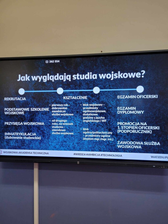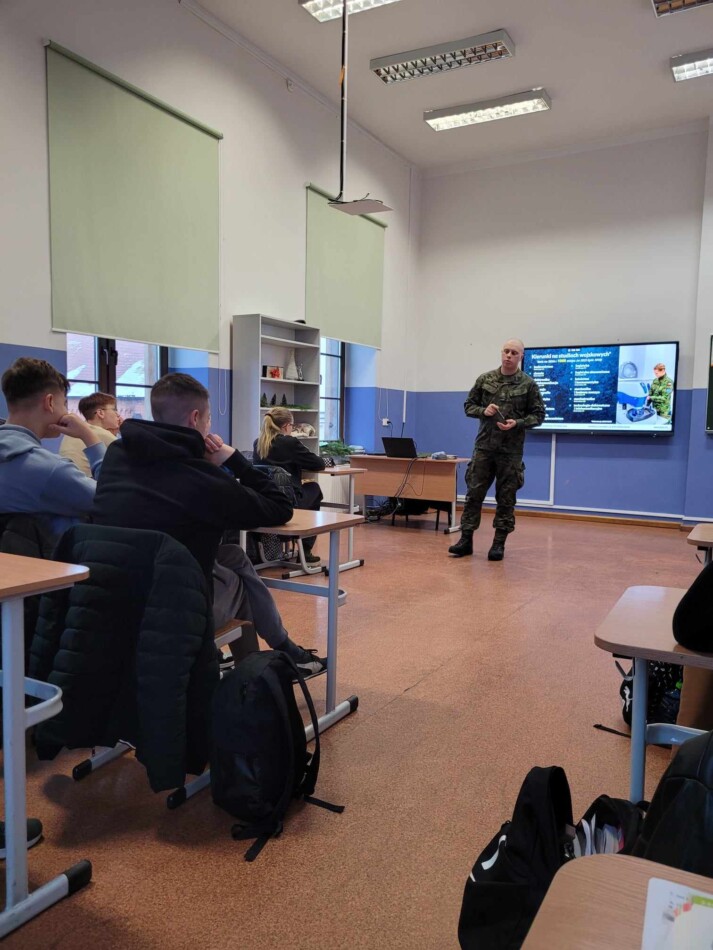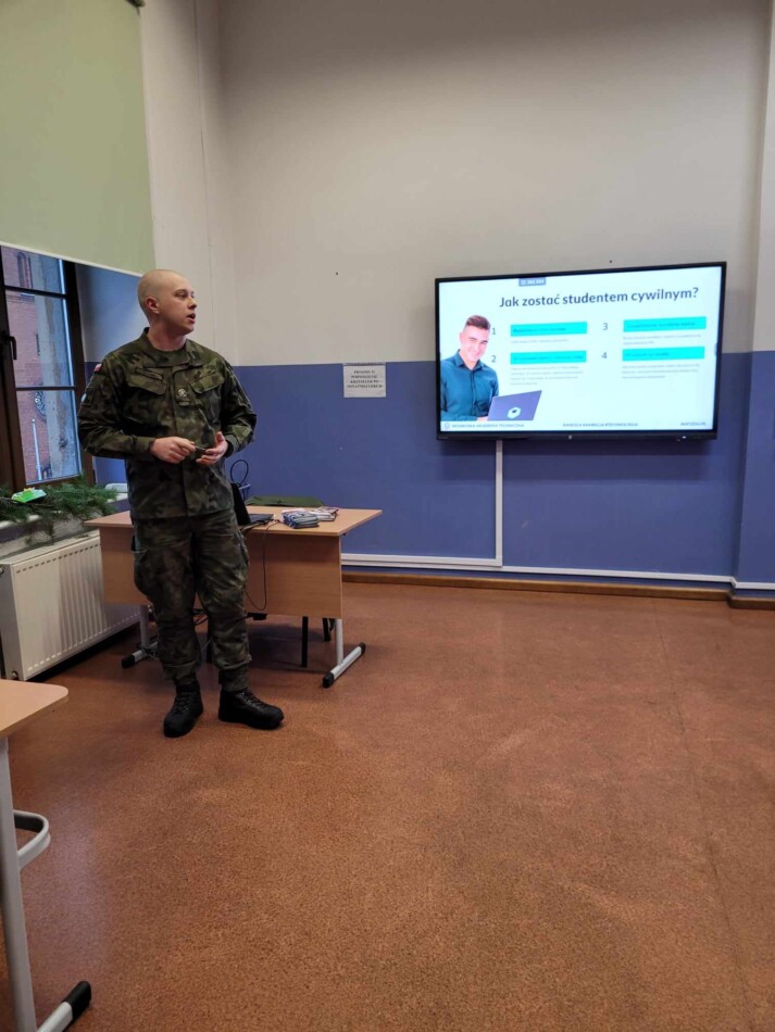 Już po raz drugi w tym roku szkolnym gościliśmy kolejnego absolwenta naszej szkoły, Miłosza Krajnika, który aktualnie jest studentem trzeciego roku Wojskowej Akademii Technicznej w Warszawie na kierunku logistyka. Przyszły żołnierz zawodowy przedstawił uczniom starszych klas zalety i korzyści studiowania na ww. uczelni. Szereg pytań skierowanych do Miłosza świadczy o dużym zainteresowaniu naszej młodzieży tym kierunkiem studiów. Warto dodać, że nauka w naszej szkole i korzystanie z proponowanych przez BZDZ kursów daje dodatkowe cenne punkty w rekrutacji na tę uczelnię. Warto zatem z nich korzystać.