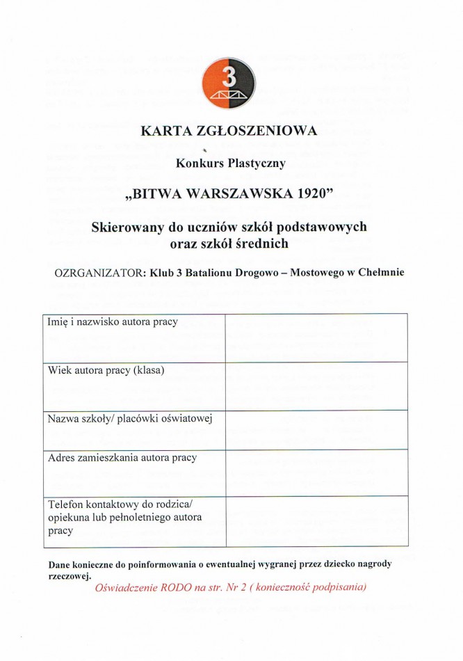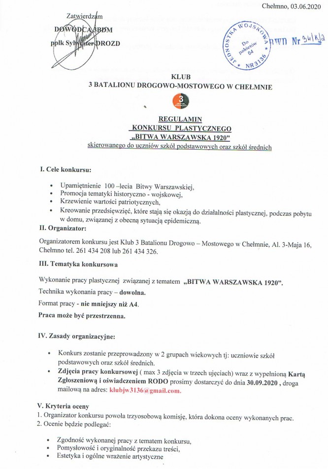 Konkurs historyczno – plastyczny Chełmiński klub 3 bdm ogłasza konkurs historyczno – plastyczny na temat BITWY WARSZAWSKIEJ 1920. Szczegóły znajdują się na zdjęciach. Zachęcamy uzdolnionych uczniów zainteresowanych tą tematyką do wzięcia udziału w konkursie:)