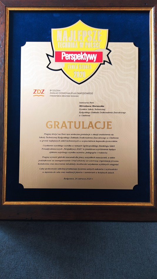 Nowy rok szkolny rozpoczął się dla nas bardzo miłym akcentem. Prezes ZDZ w Bydgoszczy, Pan Paweł Duzdowski, obdarował nas nie tylko nowo wyremontowanym budynkiem, w którym nauka to czysta przyjemność. Na ręce Pani Dyrektor złożył również ryngraf z gratulacjami za uzyskanie prestiżowego wyróżnienia w Ogólnopolskim Rankingu Szkół Ponadpodstawowych „Perspektywy 2020”. Jesteśmy w gronie jednej z najlepszych szkół technicznych w województwie kujawsko-pomorskim!