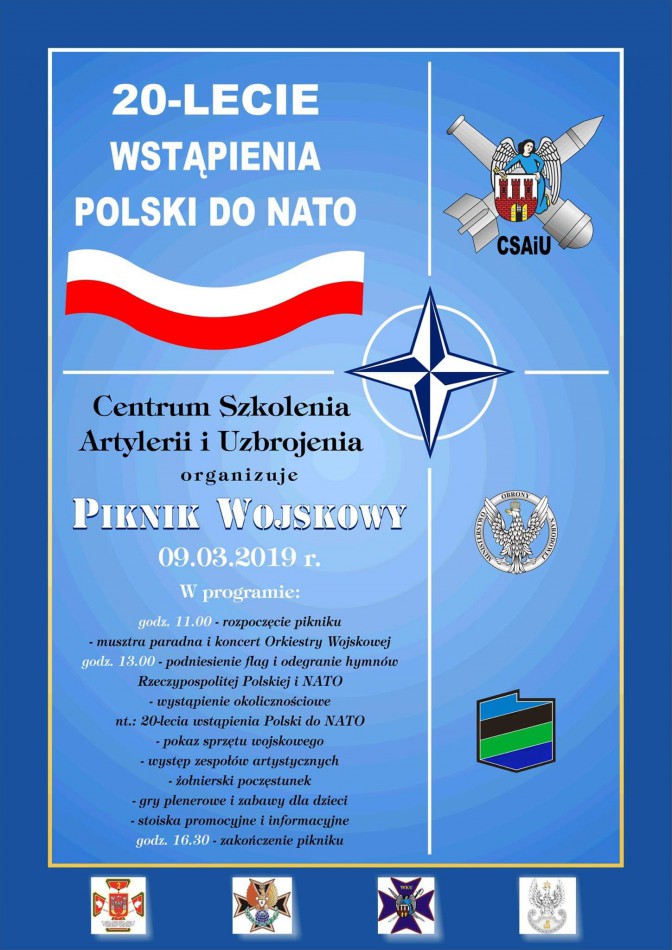 W 20. rocznicę wstąpienia Polski do NATO w 20 polskich miastach zorganizowane zostaną pikniki wojskowe. Jeden z nich odbędzie się w Toruniu. Swoje koszary dla zwiedzających otworzy Centrum Szkolenia Artylerii i Uzbrojenia przy ul. Sobieskiego. W regionie odbędzie się jeszcze jedna taka impreza – w 1 Brygadzie Logistycznej w Bydgoszczy przy ul. Powstańców Warszawy.