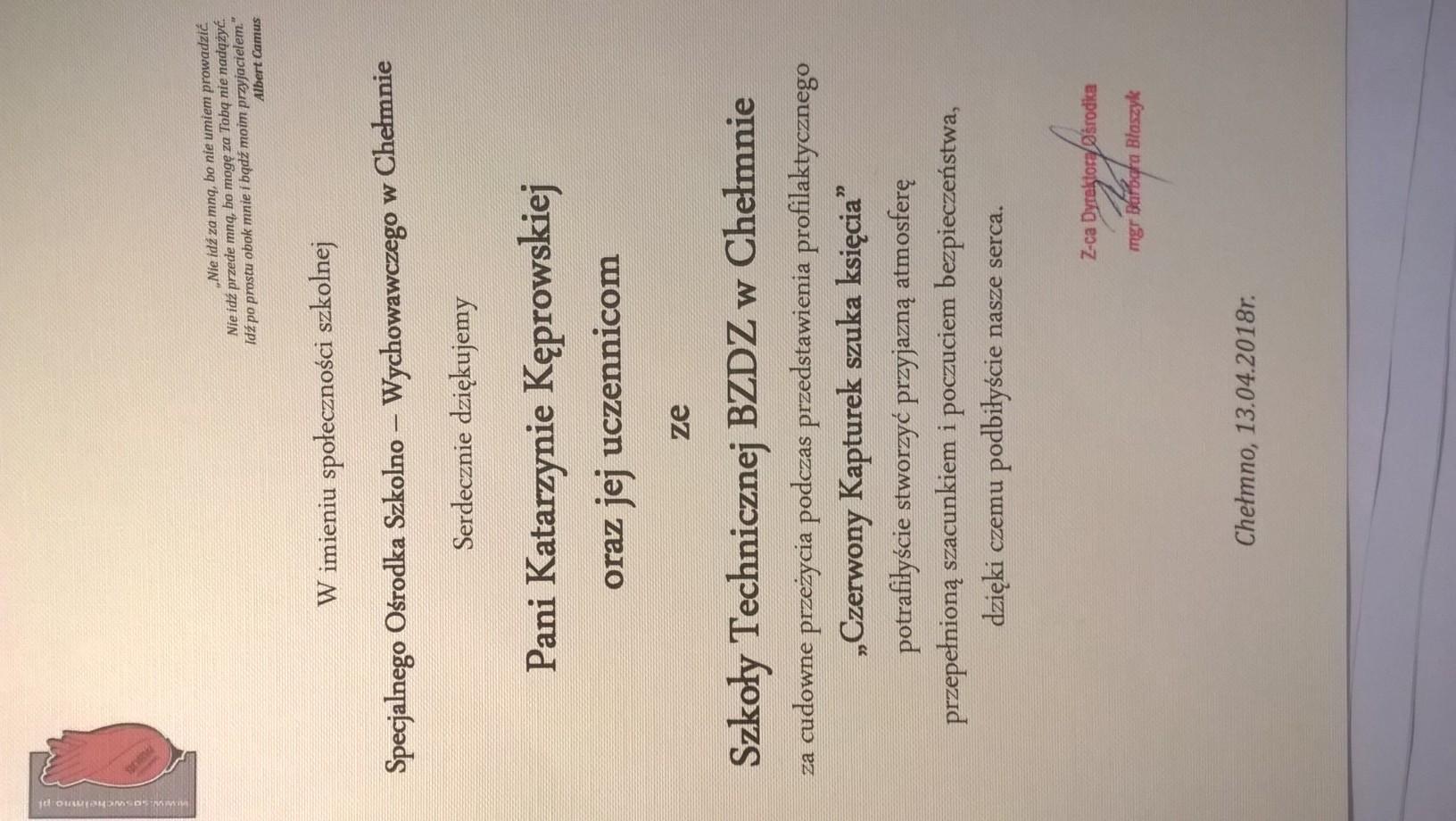 13 kwietnia 2018 r. uczennice z naszego koła teatralnego zaprezentowały uczniom Specjalnego Ośrodka Szkolno-Wychowawczego w Chełmnie przedstawienie o tematyce profilaktycznej zatytułowane Czerwony Kapturek szuka księcia. Widownia, szczerze i cudownie reagując na przekaz teatralny, podziękowała gorącymi brawami i komplementami za trud włożony w przygotowanie przedsięwzięcia. Nasze aktorki kolejny raz udowodniły, że warto dzielić się swoim talentem z innymi, przy okazji osiągając wielkie zadowolenie z realizacji swojej pasji. Przed nimi kolejne występy…
