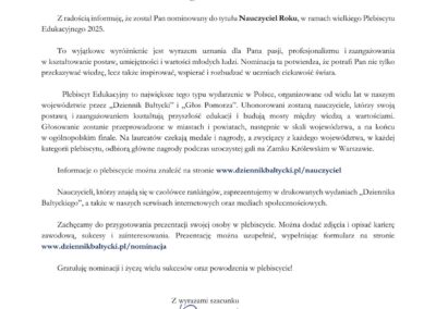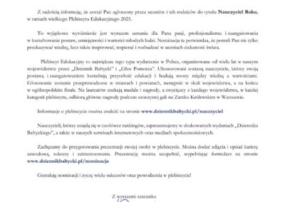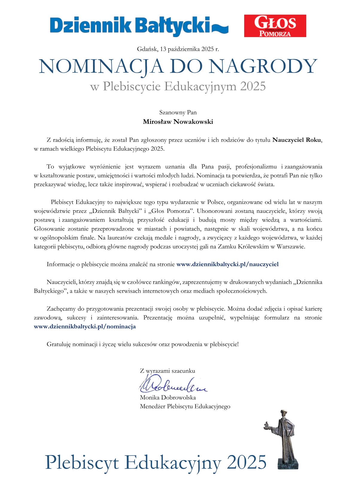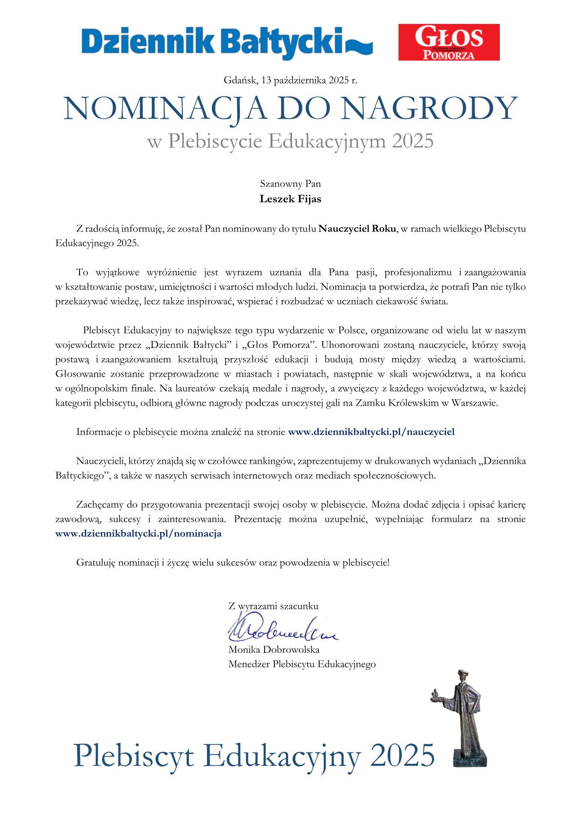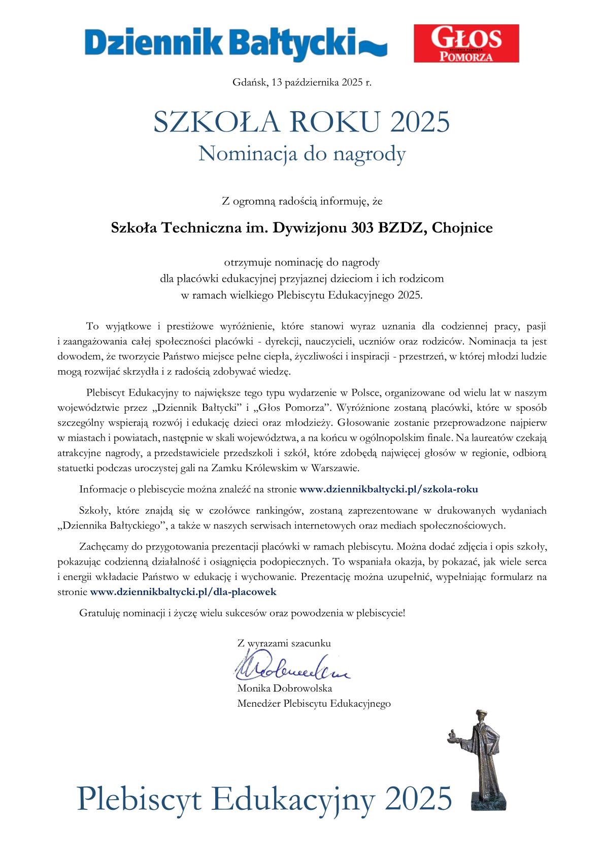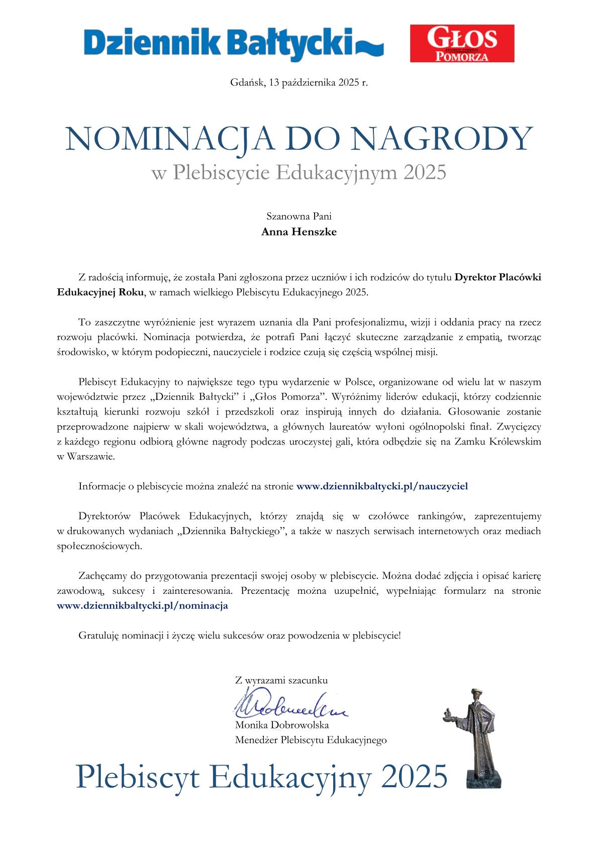 Mamy przyjemność poinformować, że nasza placówka została nominowana do prestiżowej nagrody w kategorii SZKOŁA ROKU w tegorocznej edycji Plebiscytu Edukacyjnego 2025 organizowanego przez Redakcję „Dziennika Bałtyckiego” i „Głosu Pomorza”!