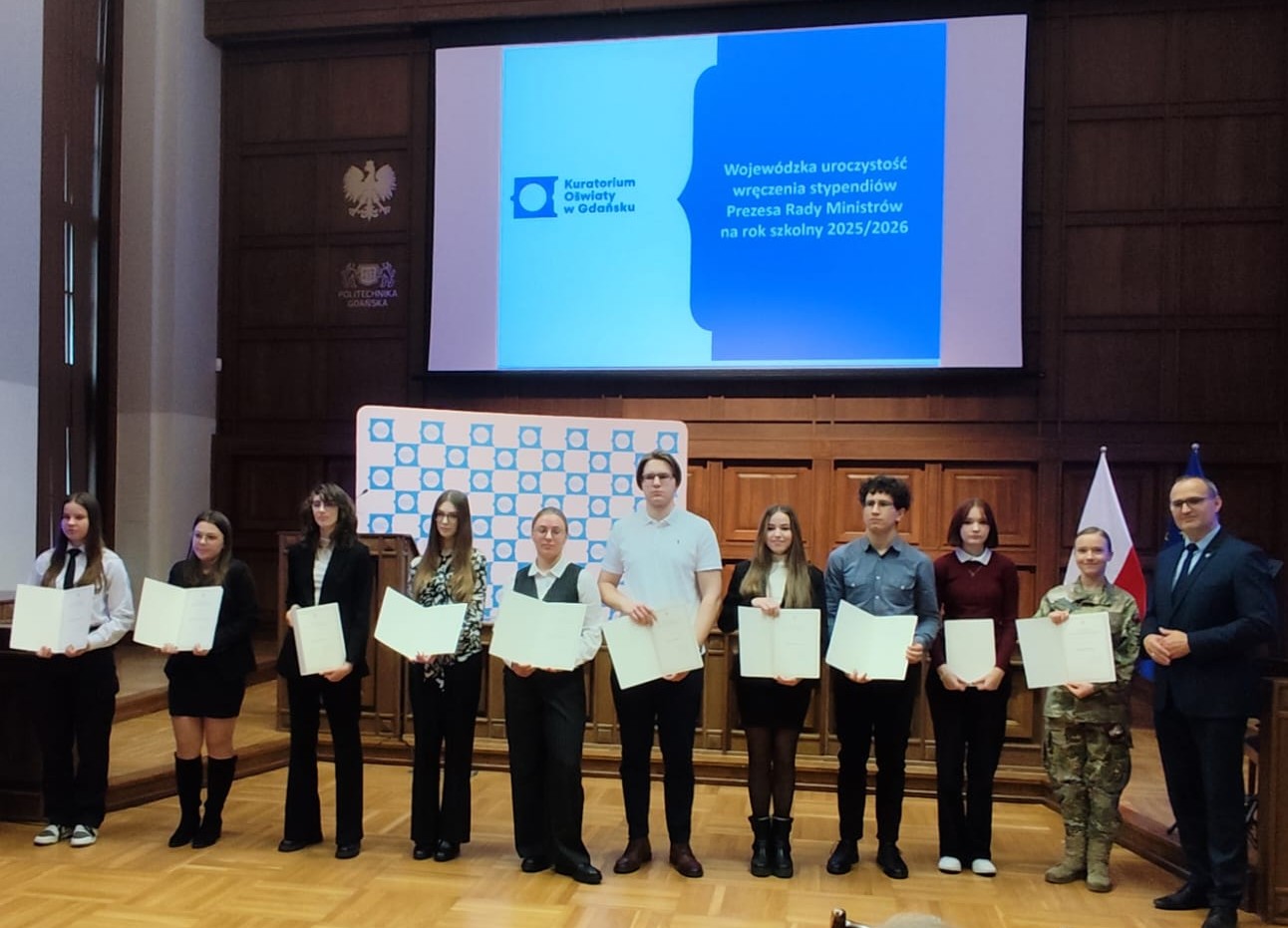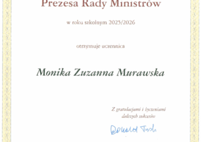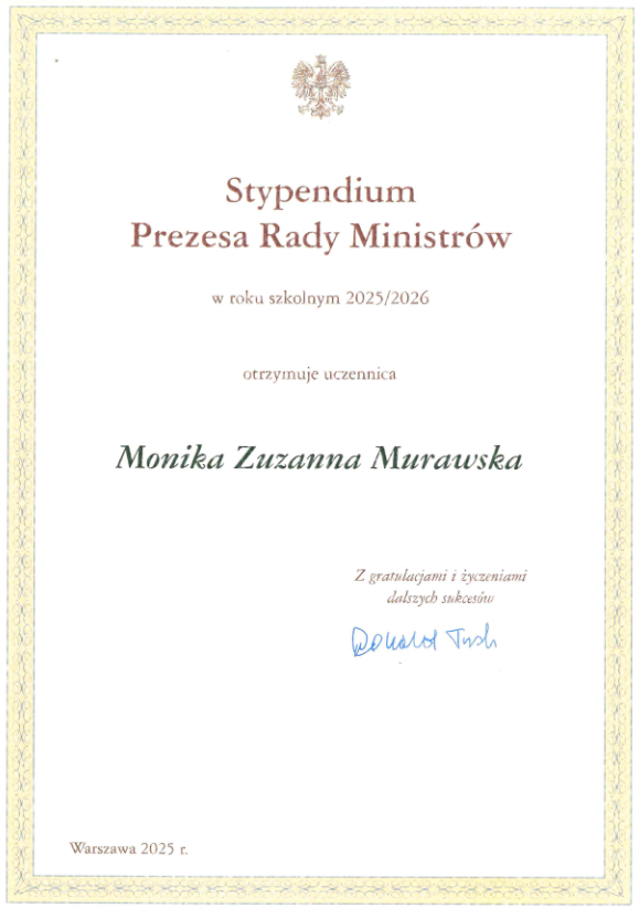 Mamy ogromną przyjemność i zaszczyt poinformować, że nasza utalentowana uczennica, Monika Murawska (klasa IV TL A), została laureatką prestiżowego Stypendium Prezesa Rady Ministrów na rok szkolny 2025/2026!