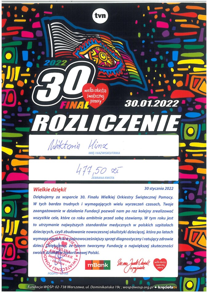 Włączyliśmy się do akcji WOŚP. Tym razem zbierano pieniądze na najwyższych standardów sprzęt do diagnostyki i leczenia wzroku u dzieci. Naszą szkołę reprezentowali: Wiktoria Hinz (3b) oraz nauczyciele – Dariusz Piekarski i Sławomir Maniawski.