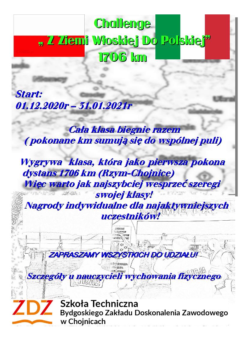 Zapraszamy wszystkich uczniów do wzięcia udziału w wyzwaniu, które polega na wspólnym przebiegnięciu 1706 km – odległości między Chojnicami a Rzymem. Pokonane w okresie od 1.12.2020 r. do 31.01.2021 r. kilometry będą sumowane i zasilą pulę danej klasy. Szczegóły u nauczycieli wychowania fizycznego.