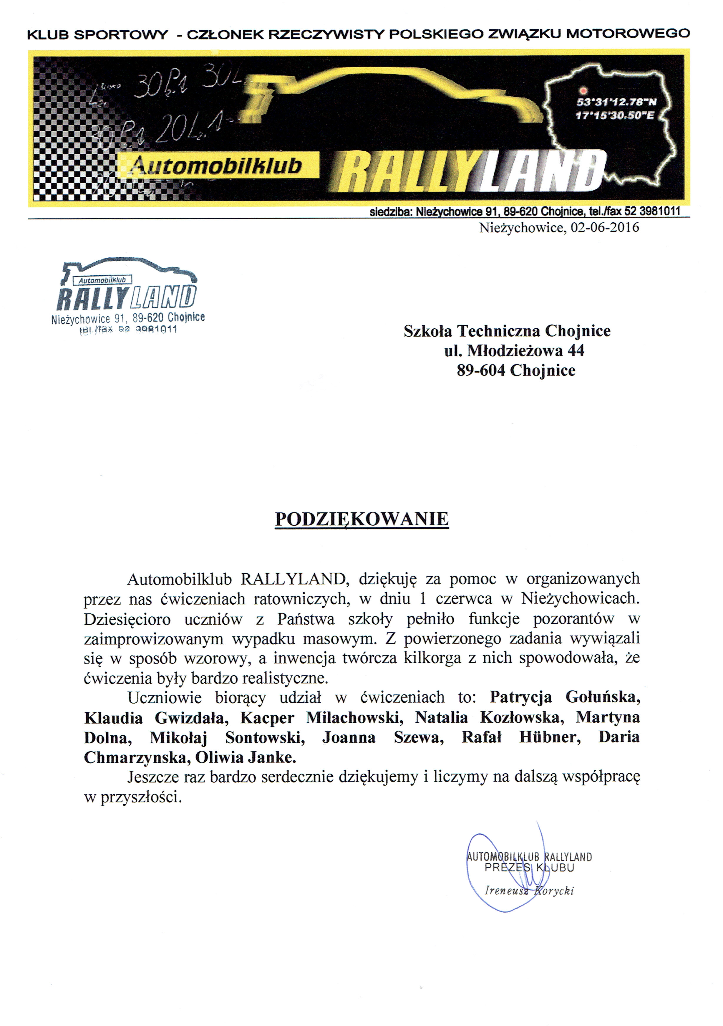 CCI201606031 czerwca 2016 r. grupa dziesięciu uczniów z klasy 1A uczestniczyła w ĆWICZENIACH SŁUŻB RATUNKOWYCH PRZY WYPADKU MASOWYM z udziałem trzech samochodów, w tym dostawczego…”Kierowca auta dostawczego przewoził „na pace” kilkanaście osób – taki był scenariusz ćwiczeń służb ratunkowych w Nieżychowicach koło Chojnic”.