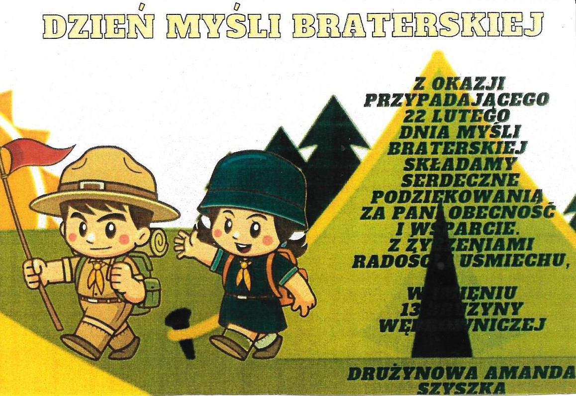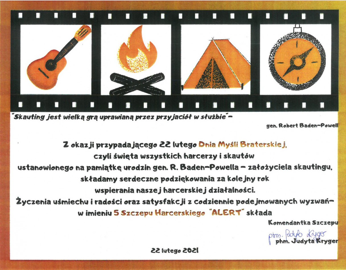 Z okazji przypadającego 22 lutego 2021 r. Dnia Myśli Braterskiej otrzymaliśmy podziękowania od 5 Szczepu Harcerskiego „Alert” oraz 13 Drużyny Wędrowniczej.