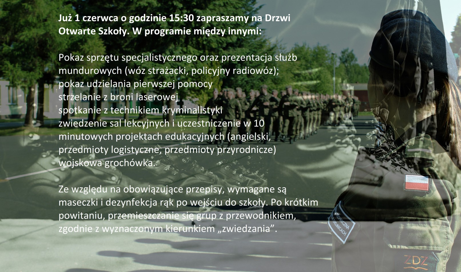 Szanowni Państwo, już 1 czerwca od godziny 15:30 do 18:00 Drzwi Otwarte Szkoły. Serdecznie zapraszamy przyszłych kadetów oraz Rodziców. W programie między innymi: