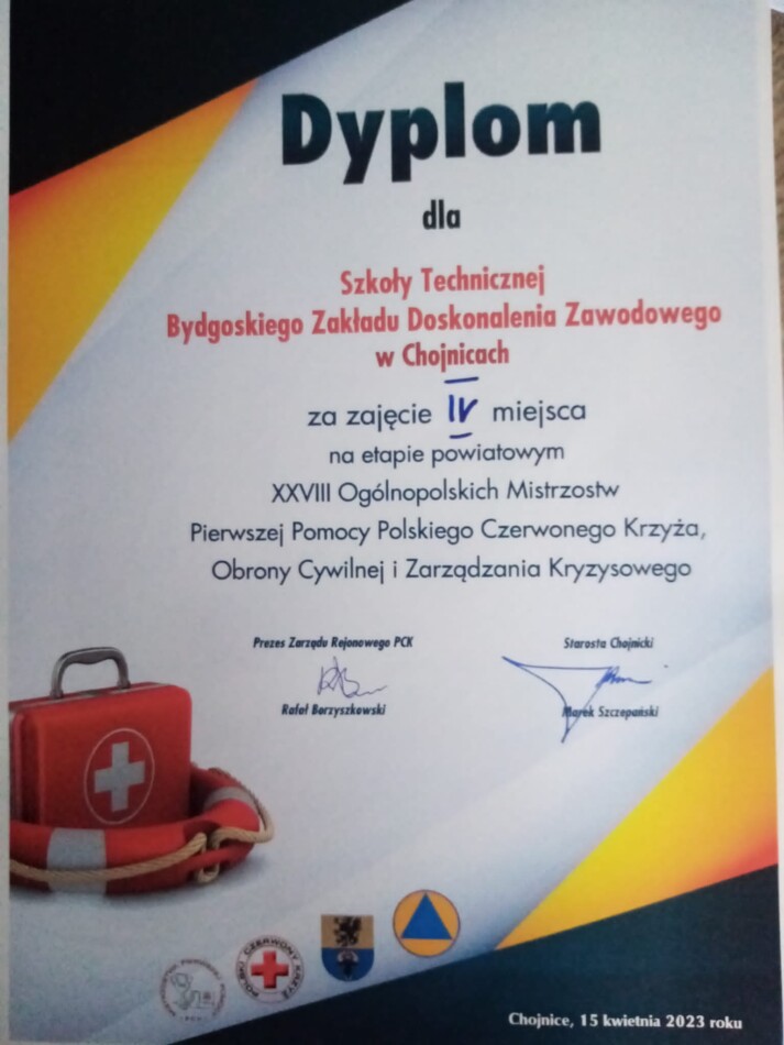 Powiatowy etap XXVIII Ogólnopolskich Mistrzostw Pierwszej Pomocy Polskiego Czerwonego Krzyża, Obrony Cywilnej i Zarządzania Kryzysowego odbył się 15 kwietnia w Zespole Szkół w Chojnicach. Nasza reprezentacja w składzie : Kamila Galikowska, Dominik Warnke, Dominik Lepak, Wiktor Petrusewicz, Michał Nisztuk zajęła IV miejsce