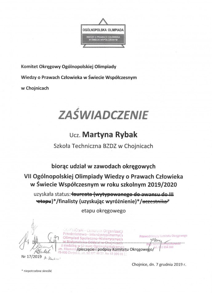 W dniu 7 grudnia 2019r. w Liceum Ogólnokształcącym im. Filomatów Chojnickich w Chojnicach odbył się finał okręgowy Olimpiady Wiedzy o Prawach Człowieka w Świecie Współczesnym. Uczennica klasy III b, Martyna Rybak, zdobyła status finalisty etapu okręgowego uzyskując wyróżnienie. Martynie serdecznie gratulujemy sukcesu!