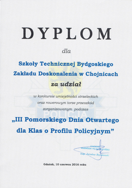 CCI20160613Dnia 10 czerwca 2016 r. młodzież naszej szkoły o profilu policyjnym brała udział w „III Dniu Otwartym dla Klas o Profilu Policyjnym”, który odbył się na terenie Oddziałów Prewencji KWP Gdańsk przy ul. Harfowej 60.