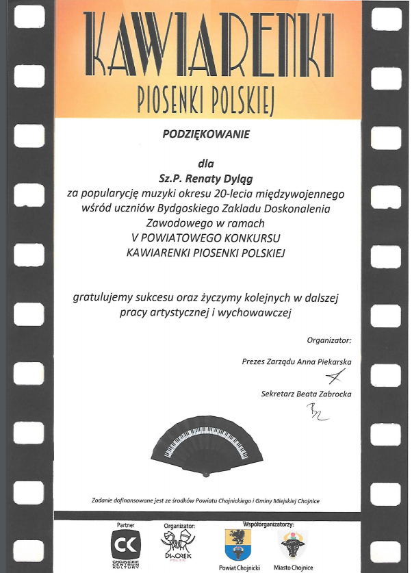 Z dumą informujemy, iż w Konkursie Piosenki XX-lecia międzywojennego organizowanym przez Stowarzyszenie Dworek Polski, nasza uczennica – Karolina Lackowska – otrzymała wyróżnienie za aktorskie wykonanie piosenek: „Bo ja się boję sama spać” oraz „Sex apeal”. Jako laureatka konkursu reprezentowała Szkołę Techniczną BZDZ w Chojnicach na Koncercie Finałowym Kawiarenki Piosenki Polskiej 11.11.2019 – w dniu Święta Niepodległości. Gratulujemy i mocno trzymamy kciuki za kolejne zwycięstwa!