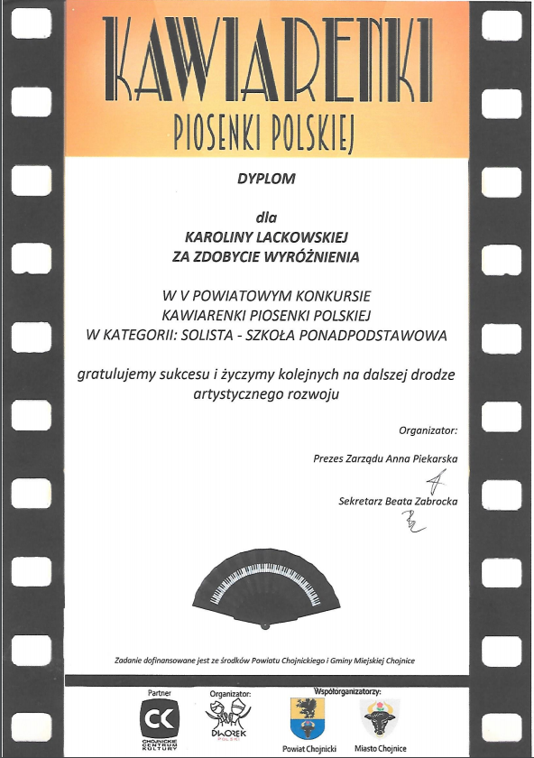 Z dumą informujemy, iż w Konkursie Piosenki XX-lecia międzywojennego organizowanym przez Stowarzyszenie Dworek Polski, nasza uczennica – Karolina Lackowska – otrzymała wyróżnienie za aktorskie wykonanie piosenek: „Bo ja się boję sama spać” oraz „Sex apeal”. Jako laureatka konkursu reprezentowała Szkołę Techniczną BZDZ w Chojnicach na Koncercie Finałowym Kawiarenki Piosenki Polskiej 11.11.2019 – w dniu Święta Niepodległości. Gratulujemy i mocno trzymamy kciuki za kolejne zwycięstwa!