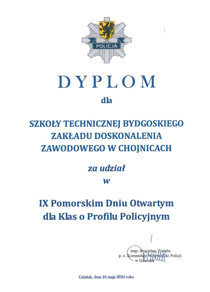 W piątek 24 maja 2024 roku klasa 1B oraz reprezentanci klasy 1TTKA, 2B i 4B wzięli udział w IX Pomorskim Dniu Otwartym dla Klas o Profilu Policyjnym. Wydarzenie, które miało miejsce na terenie Oddziału Prewencji Policji w Gdańsku, zostało objęte Patronatem Honorowym Marszałka Województwa Pomorskiego Pana Mieczysława Struka.