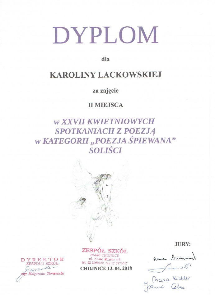 Co roku, w kwietniu w auli LO im. Filomatów Chojnickich rozbrzmiewają wiersze i śpiewana jest poetycka piosenka. W tym roku uczennica klasy IB Karolina Lackowska zajęła II miejsce w kategorii solista.
