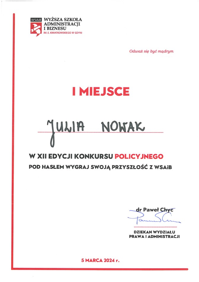 Zwycięzca tegorocznego finału została Julia Nowak – uczennica klasy IV C o profilu policyjnym, a wyróżnienie zdobył Filip Guziński – uczeń klasy IV B o profilu policyjnym.