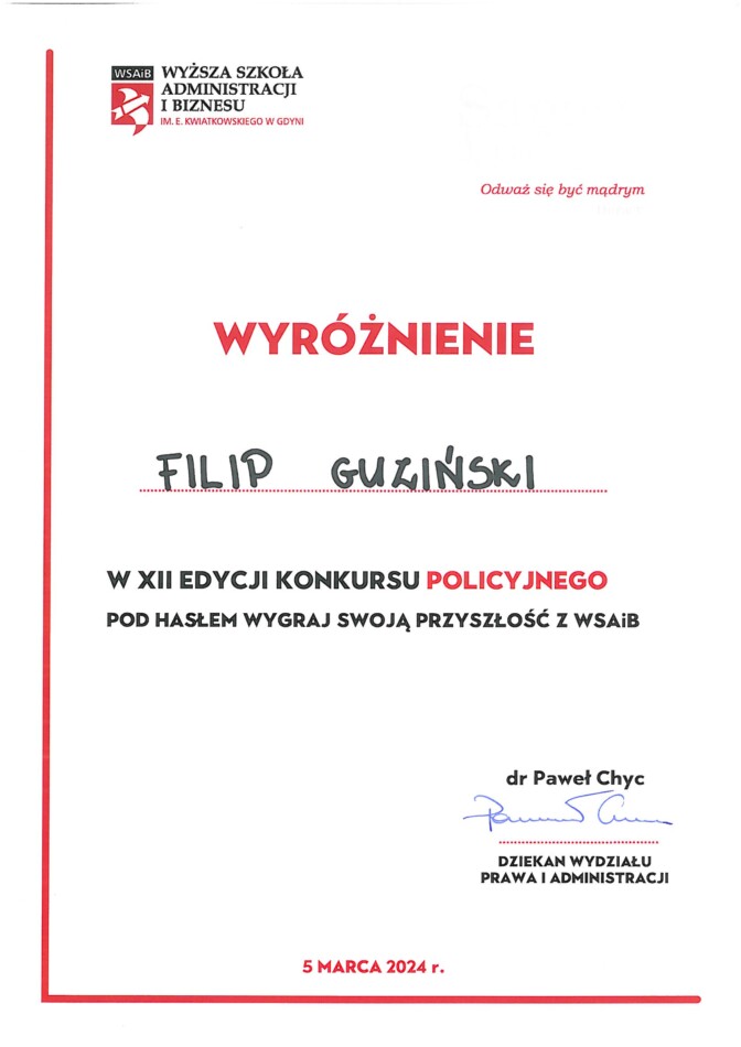 To już XII edycja Olimpiady Policyjnej organizowanej przez Wyższą Szkołę Administracji i Biznesu w Gdyni. Konkurs objął patronatem Pomorski Kurator Oświaty, a fundatorem nagród Komenda Miejska Policji w Gdyni.
