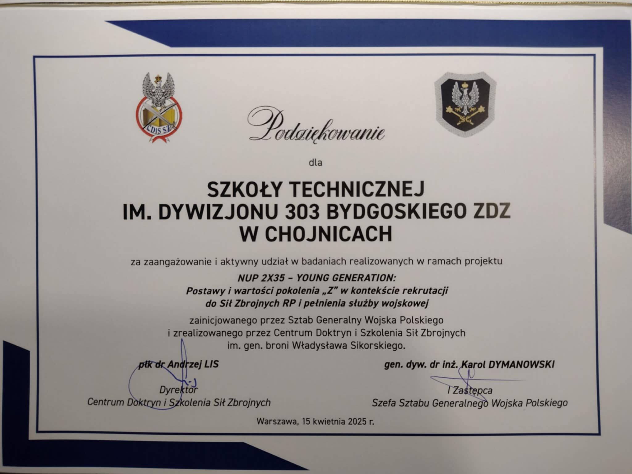 Szkoła Techniczna im. Dywizjonu 303 BZDZ w Chojnicach otrzymała z rąk Zastępcy Szefa Sztabu Generalnego Wojska Polskiego gen. dyw. dr inż. Karola Dymanowskiego i Dyrektora Centrum Doktryn i Szkolenia Sił Zbrojnych płk. dr Andrzeja Lisa – podziękowanie za zaangażowanie i aktywny udział w badaniach realizowanych w ramach projektu NUP 2X35 – YOUNG GENERATION: Postawy i wartości pokolenia „Z” w kontekście rekrutacji do Sił Zbrojnych RP i pełnienia służby wojskowej.