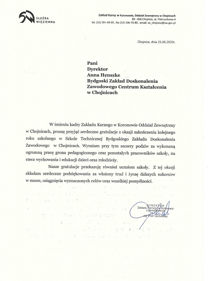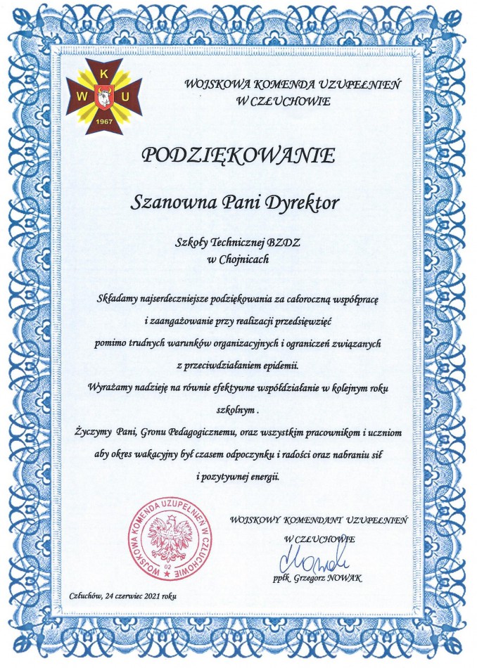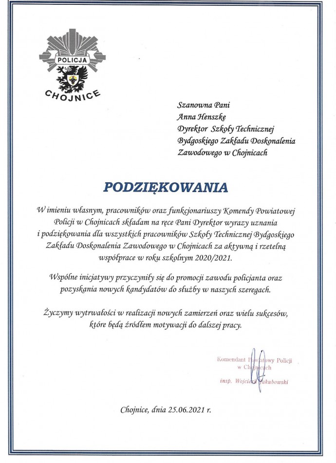 Podziękowania od zaprzyjaźnionych służb mundurowych dla Dyrektora Szkoły Technicznej BZDZ w Chojnicach oraz Grona Pedagogicznego, Pracowników i Uczniów: