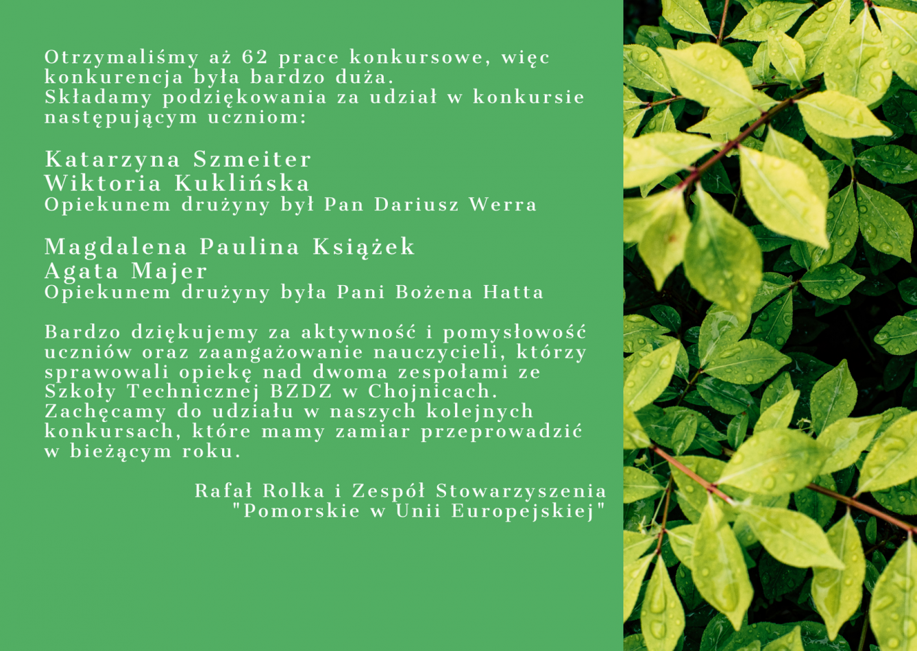 Otrzymaliśmy podziękowania od Stowarzyszenia „Pomorskie w Unii Europejskiej”  za udział  naszych uczniów w wojewódzkim konkursie „Zielona Europa – zróbmy to razem!”.