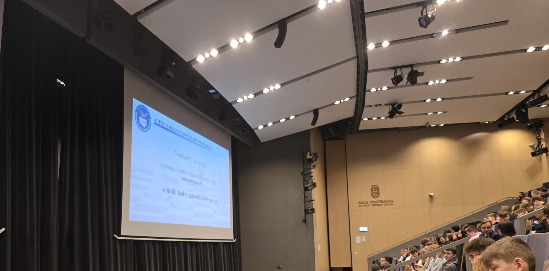 W zeszłym tygodniu odbyło się spotkanie w Sali Teatralnej budynku Neofilologii Uniwersytetu Gdańskiego. Przedstawiciel Agencji Bezpieczeństwa Wewnętrznego przybliżył zgromadzonym strukturę ABW oraz zadania podejmowane przez jednostkę. Uczniowie naszej szkoły mieli okazję usłyszeć, na czym polega ochrona bezpieczeństwa wewnętrznego państwa, w jaki sposób funkcjonariusze przeciwdziałają zagrożeniom, dlaczego tak ważna jest ochrona informacji niejawnych. Przedstawione zostały również przykłady z pracy operacyjnej Agencji.