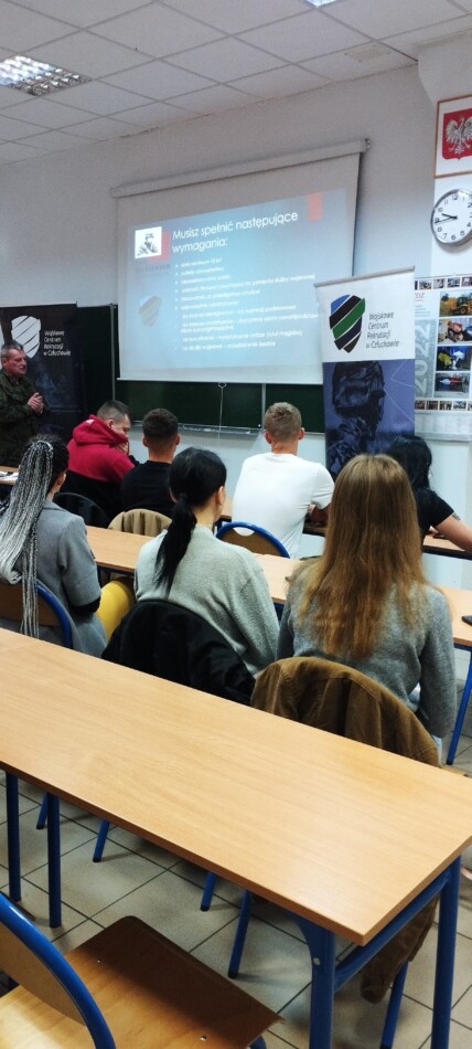 27.09.2022r. w ramach akcji Centralnego Wojskowego Centrum Rekrutacji „Poznaj Swojego Rekrutera”, odbyły się dwa spotkania z klasami IV A i C – CWKM dot. ochotniczych rodzajów służby wojskowej, które prowadził przedstawiciel WCR w Człuchowie – Szef Wydziału mjr Andrzej Gejda.