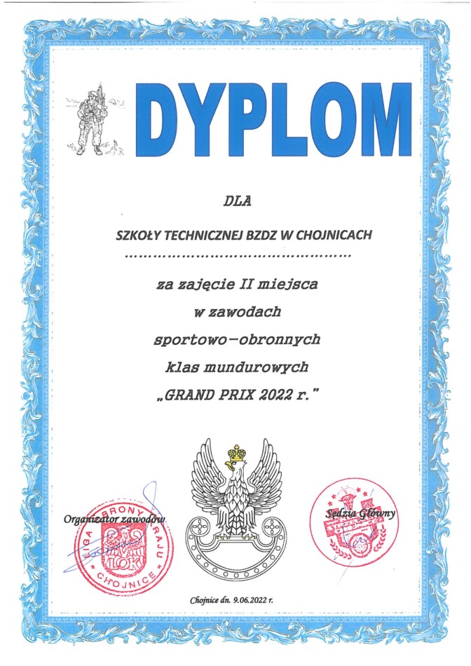 Kolejny raz wzięliśmy udział w zawodach klas mundurowych w ramach „GRAND PRIX 2022” zorganizowanych przez ZM LOK Chojnice i Urząd Miasta Chojnice. Wszystkie konkurencje rozgrywane były przez okres trzech miesięcy. W kwietniu odbył się test wiedzy o obronności kraju. Patryk Leszczyński (3 a) zajął 3 miejsce na 234 uczestników! 🤩👏 W maju miały miejsce zawody strzeleckie, które wygrał Aleks Lepak (2 c)! 🥇🤩🥳👏 W czerwcu – biegi przełajowe. Na pierwszych dwóch miejscach 🥇 Mateusz Materac i 🥈 Kacper Orlikowski! 🥳👏