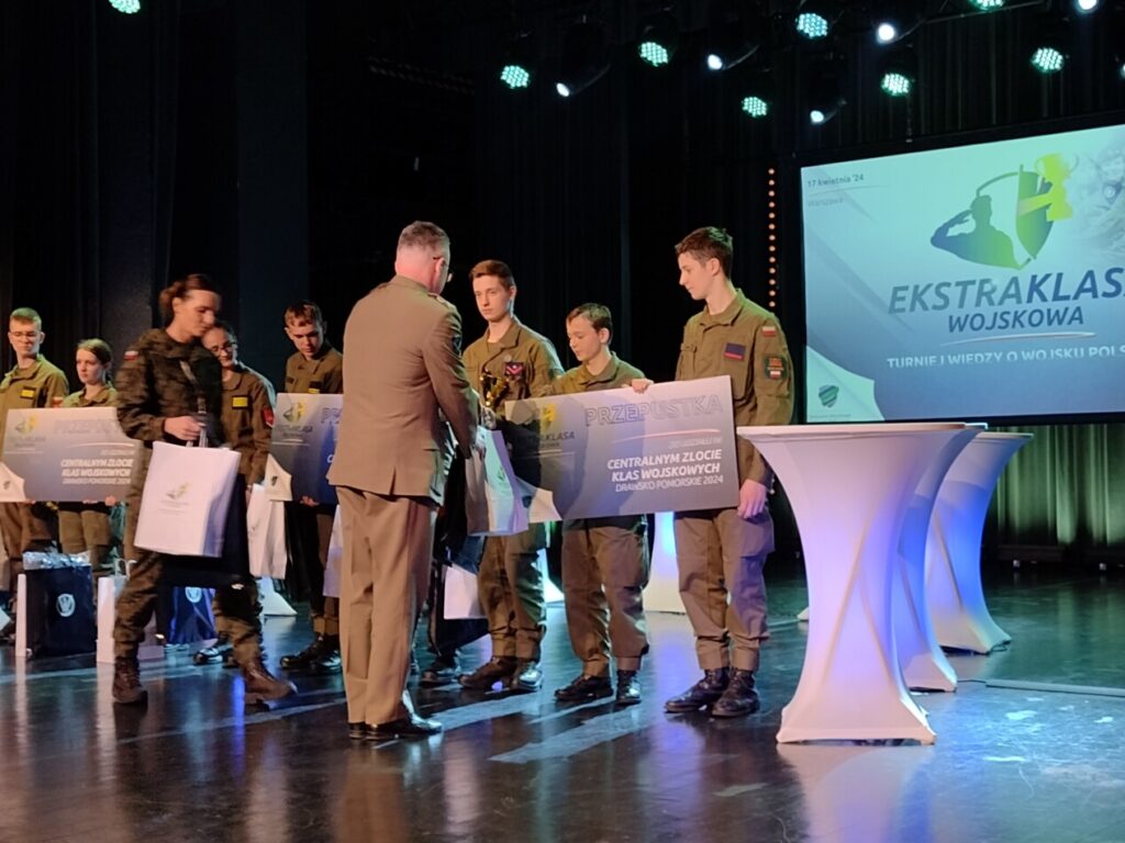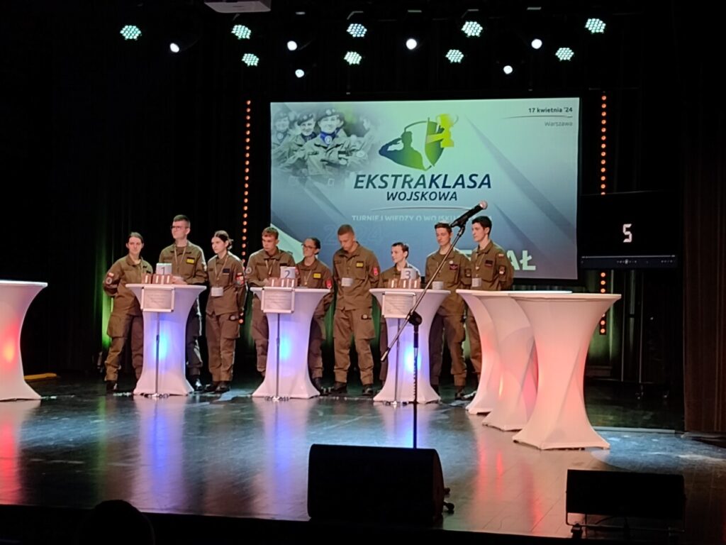 W dniu 17.04.2024 w Warszawie przeprowadzony został III etap – centralny, Turnieju Wiedzy o Wojsku Polskim „EKSTRAKLASA WOJSKOWA”. W turnieju przeprowadzonym w Klubie Dowództwa Garnizonu Warszawa udział wzięło 16 zwycięskich drużyn ze wszystkich województw ( mistrzów z każdego województwa). Nasi chłopcy wykazali się ogromną wiedzą wojskową, myśleniem, a przede wszystkim zachowali tzw. „zimną krew”. Nie poddali się emocjom i spokojnie wyszli z półfinału. W finale natomiast pokazali mistrzostwo – odpowiedzieli na siedem zadanych pytań i zachowując wszystkie trzy szanse oraz zyskując uznanie u sędziów turnieju za posiadaną wiedzę, pełnię wypowiedzi i właściwą postawę w walce – weszli do ścisłego finału, w którym znalazły się trzy najlepsze drużyny. Nasi chłopcy walczyli do końca. Jednakże zabrakło odrobiny szczęścia.