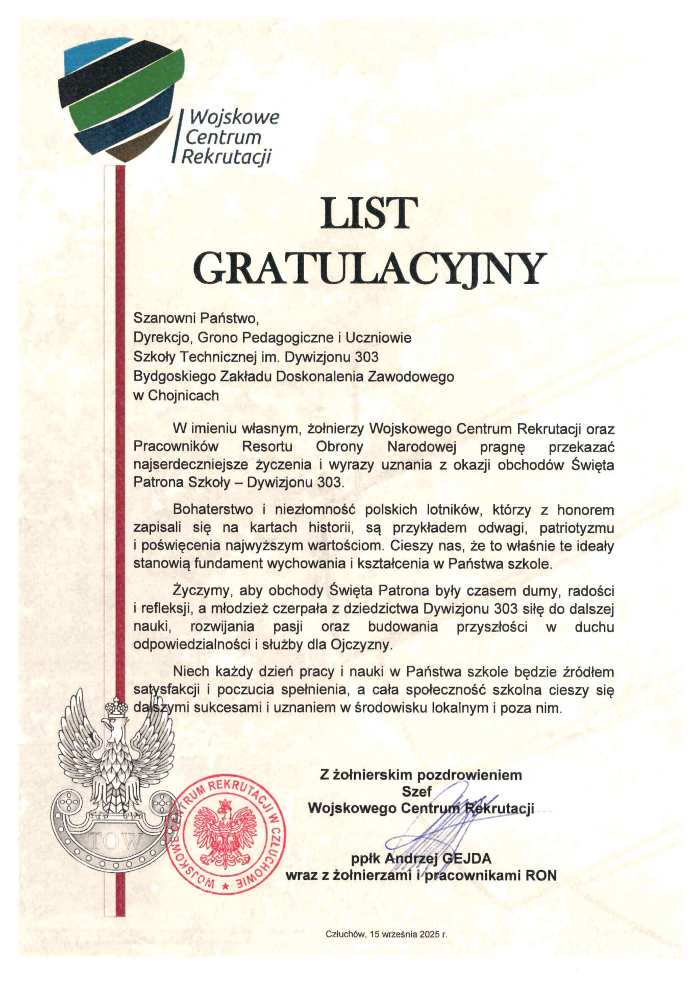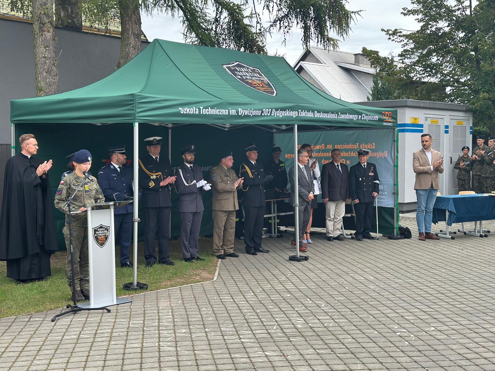 15 września w naszej szkole uczciliśmy pamięć naszego Patrona – legendarnego Dywizjonu 303 – uroczystym apelem. To ważne wydarzenie było hołdem dla bohaterstwa polskich lotników, którzy walczyli o wolność podczas II wojny światowej. Uroczystość zaszczycili swoją obecnością przedstawiciele zaprzyjaźnionych służb mundurowych, Prezes Zarządu Bydgoskiego Zakładu Doskonalenia Zawodowego – pan Paweł Duzdowski oraz gość specjalny, pan Henryk Konarski, prezes Koła nr 9 Związku Żołnierzy Wojska Polskiego.