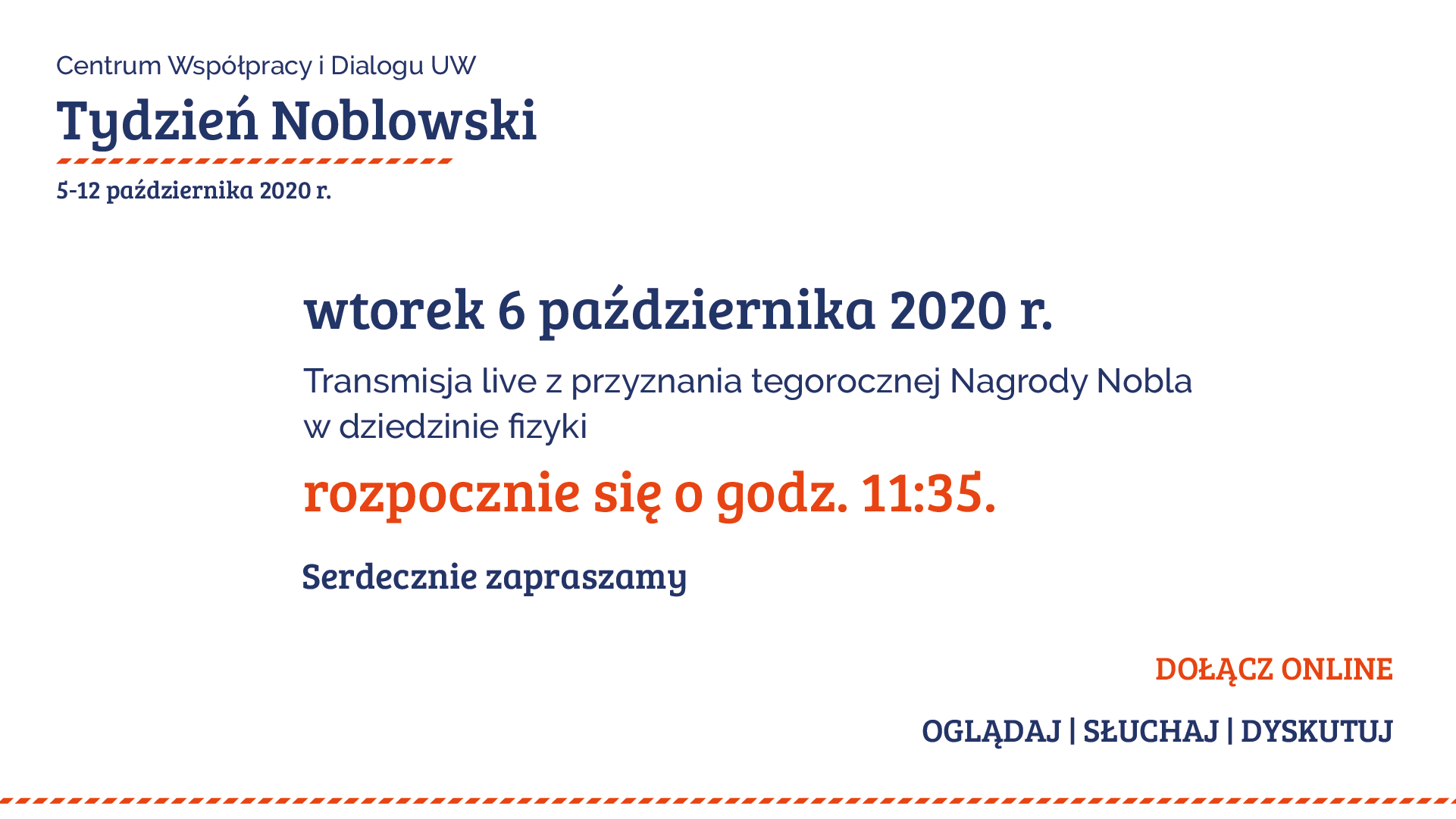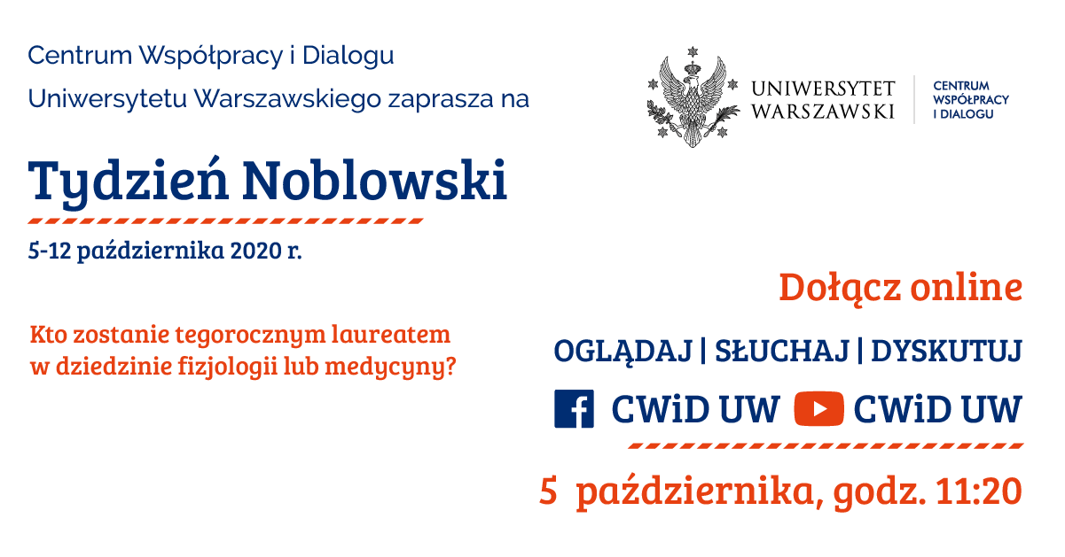 Bierzemy udział w Tygodniu Noblowskim organizowanym przez Centrum Współpracy i Dialogu działającym przy Uniwersytecie Warszawskim. Od wczoraj w Sztokholmie przyznawane są najbardziej prestiżowe nagrody w świecie nauki – Nagrody Nobla. Eksperci UW i Warszawskiego Uniwersytetu Medycznego relacjonują na żywo ogłaszanie tegorocznych noblistów oraz przybliżają znaczenie wyróżnionych osiągnięć.