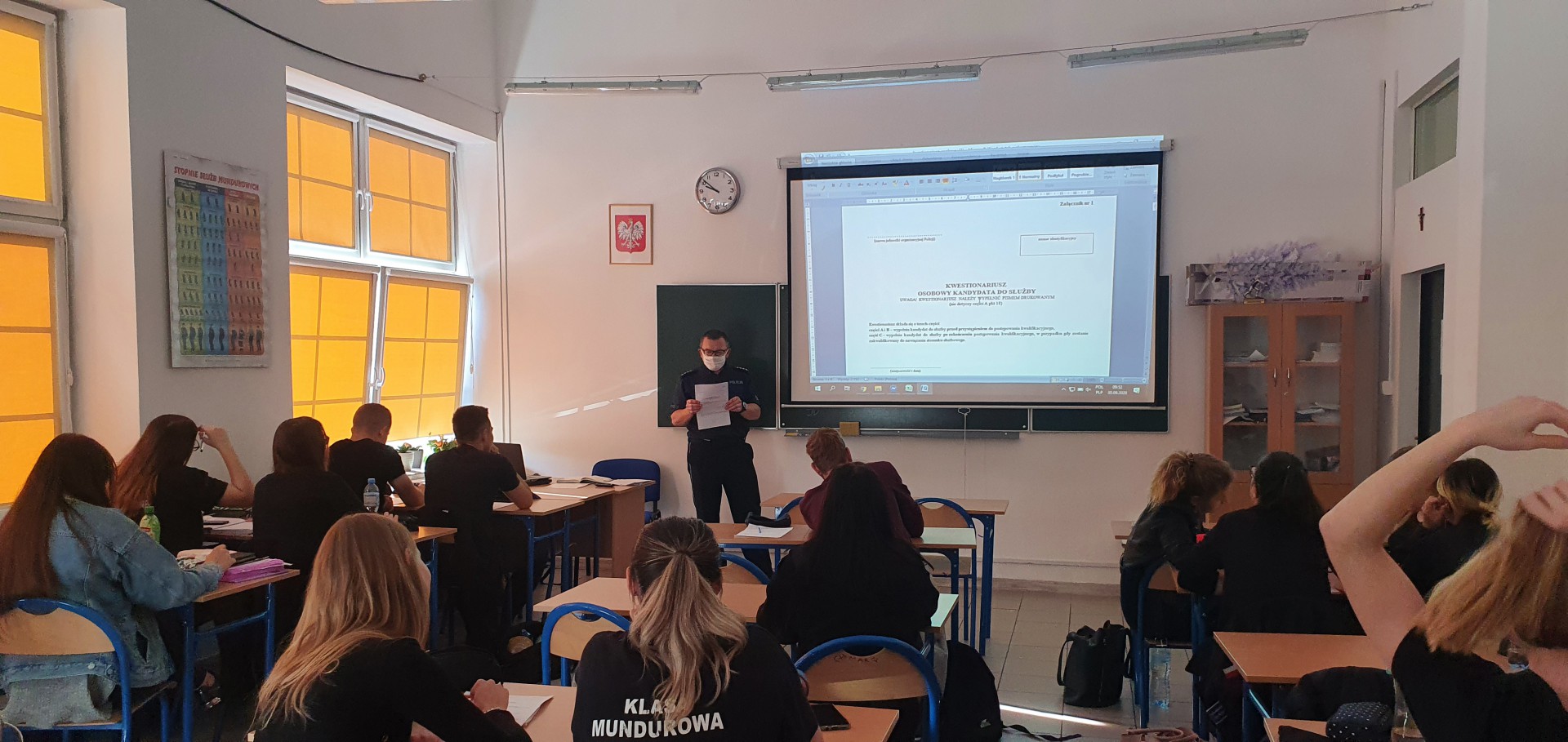 Aspirant sztabowy Dariusz Piekarski z Komendy Powiatowej Policji w Chojnicach przybliżył uczniom naszej szkoły służbę w policji, a w części praktycznej pokazał jak wypełnić kwestionariusz osobowy kandydata do służby. Przedstawił również zagadnienia związane z pracą w policji uczniom klas IV o profilu policyjnym. Niedługo kończą oni etap szkolny i podejmą decyzję o dalszej drodze zawodowej.