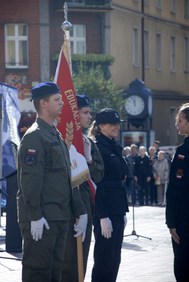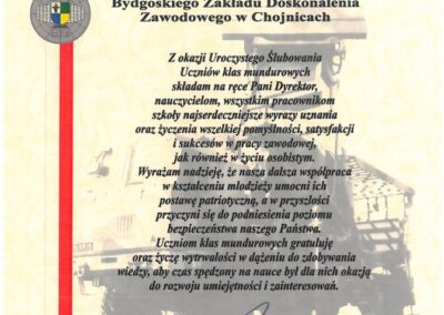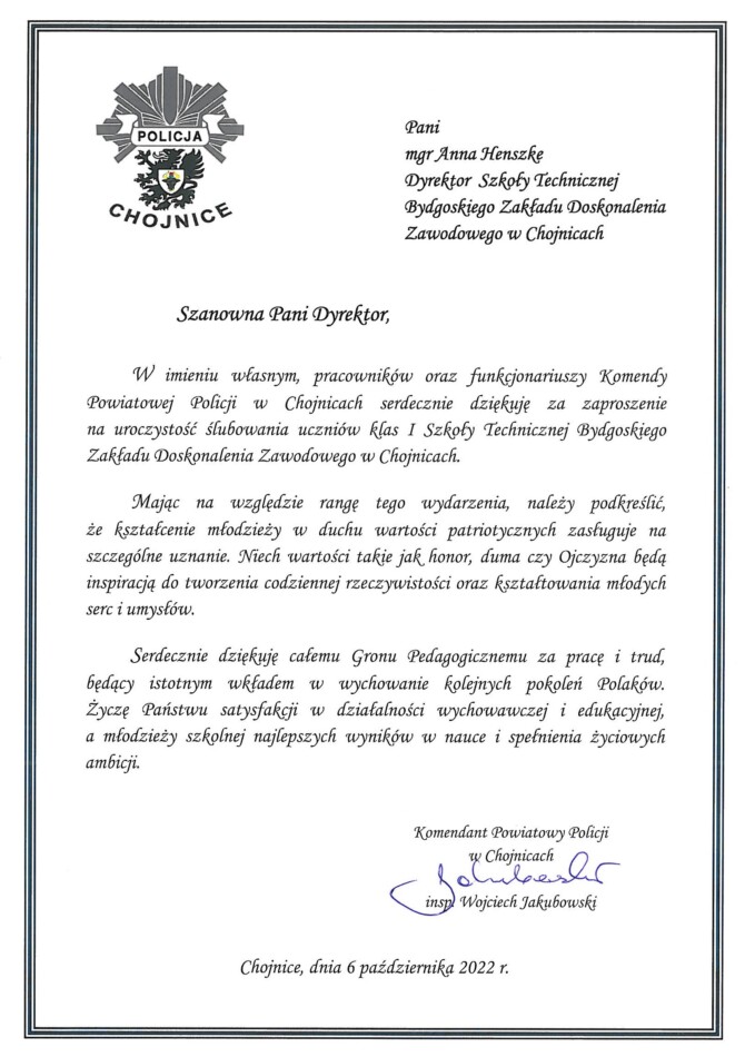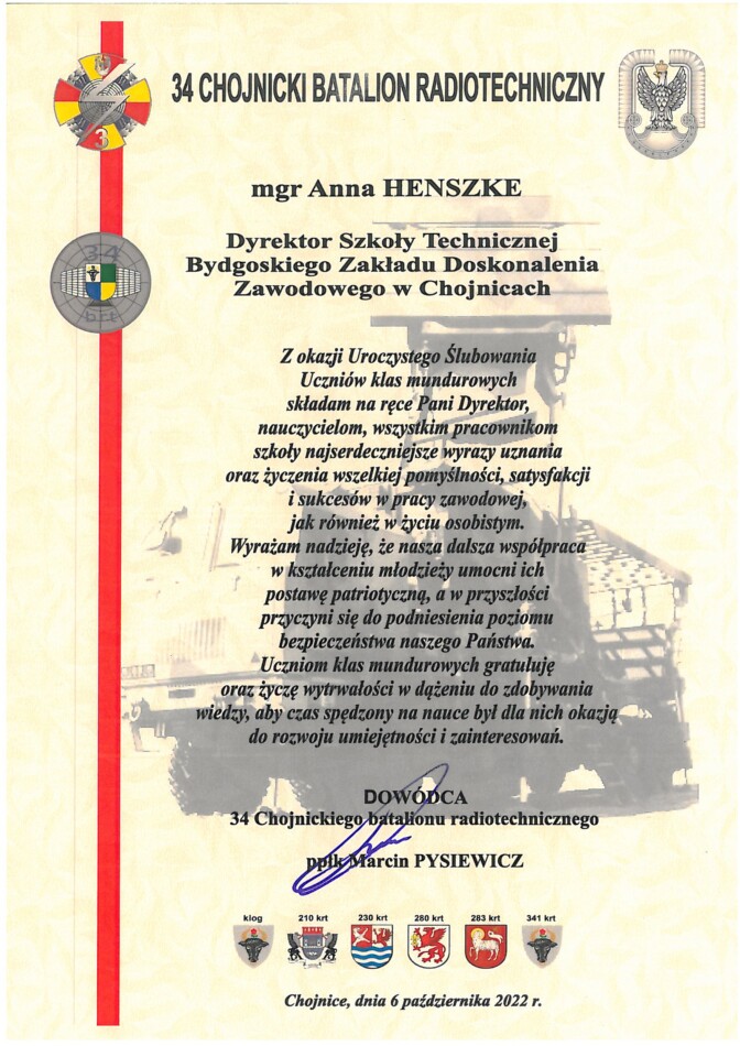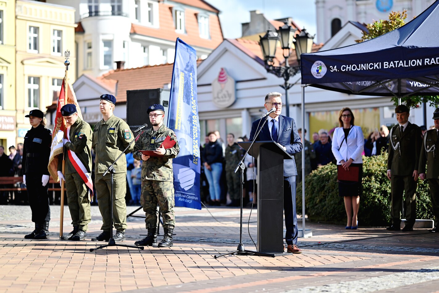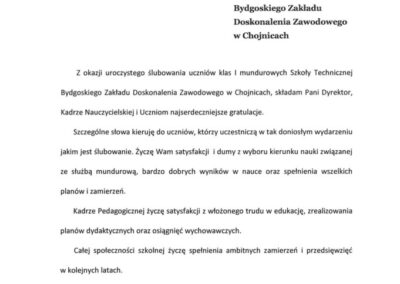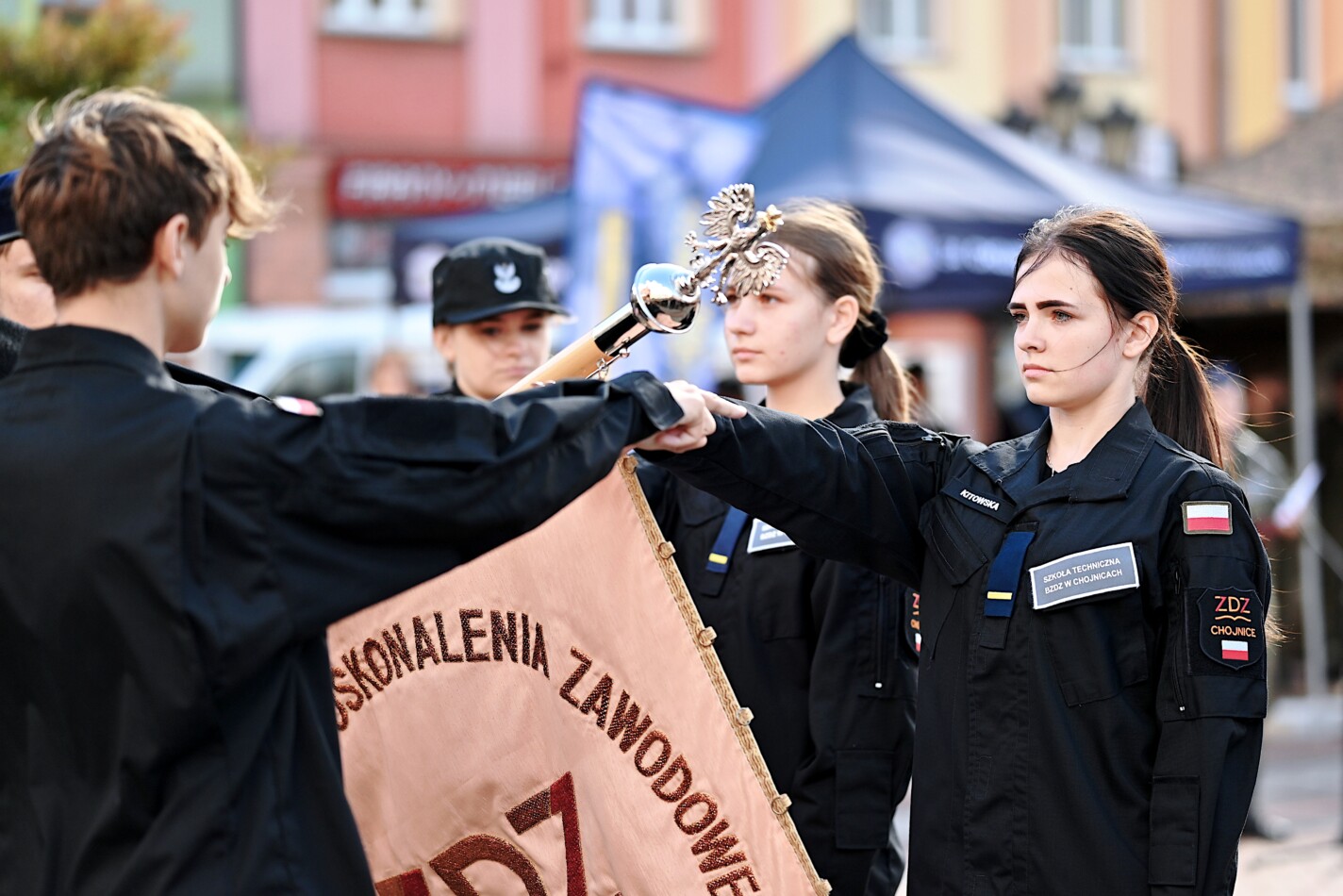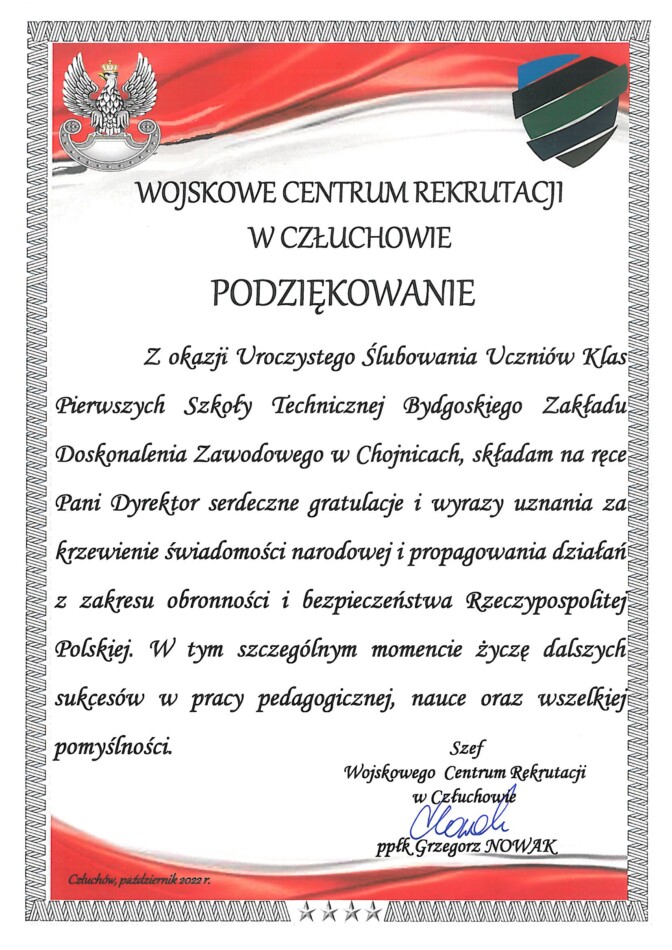6 października 2022r. na chojnickim rynku odbyło się uroczyste ślubowanie uczniów klas I Szkoły Technicznej Bydgoskiego Zakładu Doskonalenia Zawodowego w Chojnicach. Podczas uroczystości gościliśmy: Prezesa Zarządu BZDZ – Pana Pawła Duzdowskiego, przedstawiciela 7. Pomorskiej Brygady Obrony Terytorialnej – Dowódcę Batalionu – Pana ppłk Marcina Łyskanowskiego, Przedstawiciela 34. Chojnickiego Batalionu Radiotechnicznego – Pana kpt Kamila Okrój, Zastępcę Komendanta Powiatowego Policji w Chojnicach – Panią mł. isnp. Annę Kos, przedstawiciela Komendy Powiatowej PSP w Chojnicach – Pana mł. bryg. Rafała Buszek, Szefa Wydziału Rekrutacji Wojskowego Centrum Rekrutacji w Człuchowie – Pana mjr Andrzeja Gejdę, przedstawicielkę Oddziału Zewnętrznego w Chojnicach – Panią mjr Karolinę Stadnicką, Naczelnika OSP w Chojnicach – druha Arkadiusza Rusinek, Przewodniczącą Rady Miasta Chojnice – Panią Renatę Dąbrowską. Obecni byli także wszyscy uczniowie, grono pedagogiczne oraz mieszkańcy Chojnic.