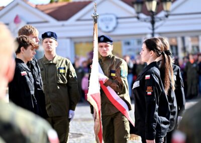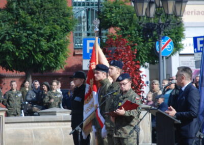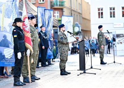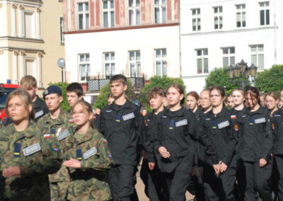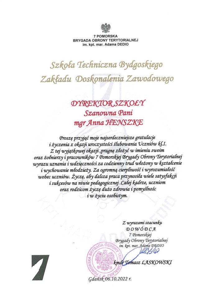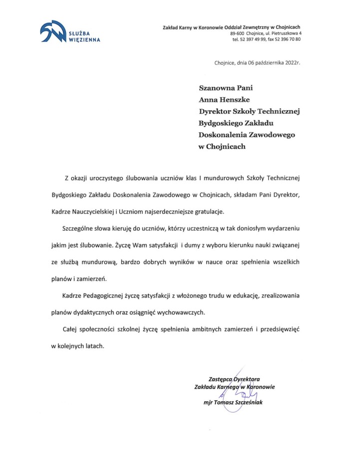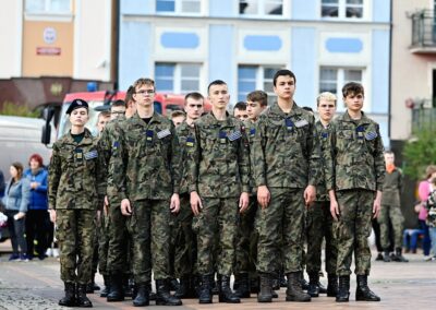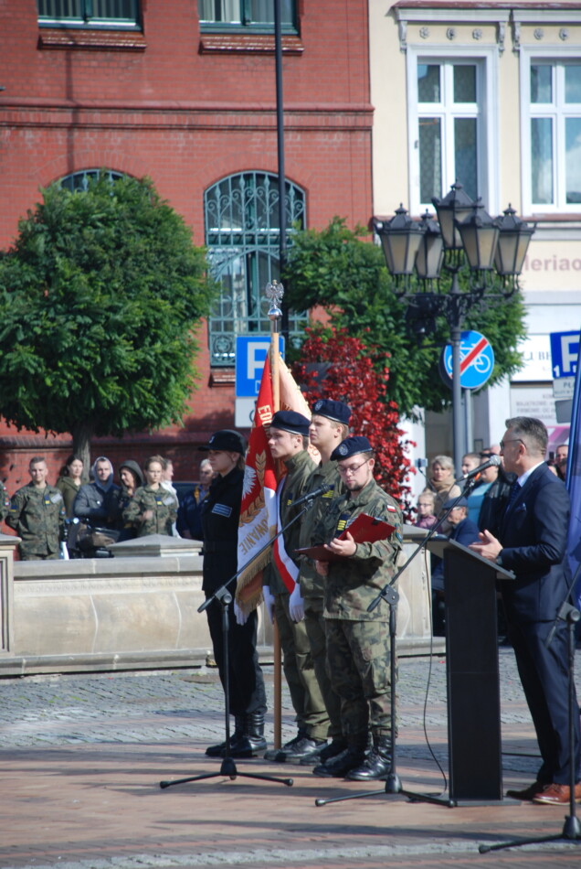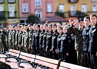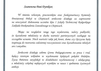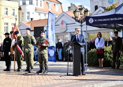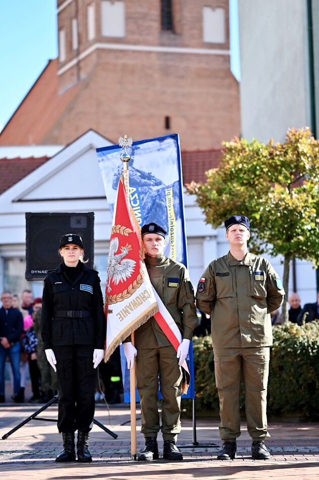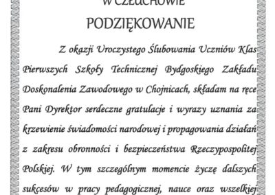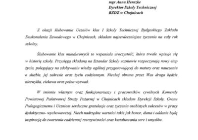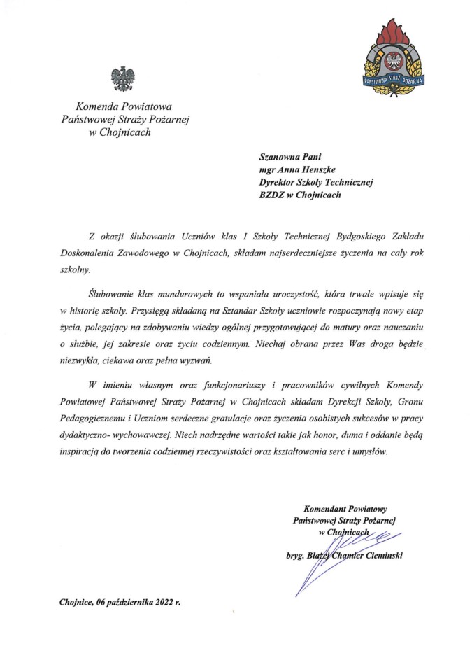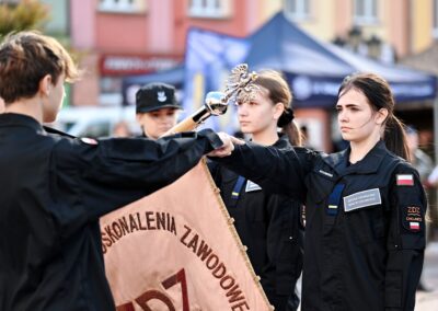6 października 2022r. na chojnickim rynku odbyło się uroczyste ślubowanie uczniów klas I Szkoły Technicznej Bydgoskiego Zakładu Doskonalenia Zawodowego w Chojnicach. Podczas uroczystości gościliśmy: Prezesa Zarządu BZDZ – Pana Pawła Duzdowskiego, przedstawiciela 7. Pomorskiej Brygady Obrony Terytorialnej – Dowódcę Batalionu – Pana ppłk Marcina Łyskanowskiego, Przedstawiciela 34. Chojnickiego Batalionu Radiotechnicznego – Pana kpt Kamila Okrój, Zastępcę Komendanta Powiatowego Policji w Chojnicach – Panią mł. isnp. Annę Kos, przedstawiciela Komendy Powiatowej PSP w Chojnicach – Pana mł. bryg. Rafała Buszek, Szefa Wydziału Rekrutacji Wojskowego Centrum Rekrutacji w Człuchowie – Pana mjr Andrzeja Gejdę, przedstawicielkę Oddziału Zewnętrznego w Chojnicach – Panią mjr Karolinę Stadnicką, Naczelnika OSP w Chojnicach – druha Arkadiusza Rusinek, Przewodniczącą Rady Miasta Chojnice – Panią Renatę Dąbrowską. Obecni byli także wszyscy uczniowie, grono pedagogiczne oraz mieszkańcy Chojnic.