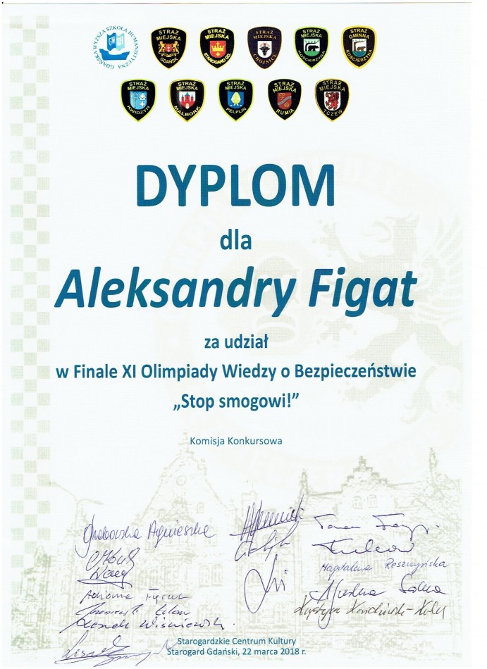W dniu 22.03.2018 r. w Starogardzie Gdańskim odbył się finał XI edycji „Olimpiady Wiedzy o Bezpieczeństwie”. W eliminacjach etapu szkolonego wzięło udział 926 uczniów z 43 szkół ponadgimnazjalnych naszego województwa.