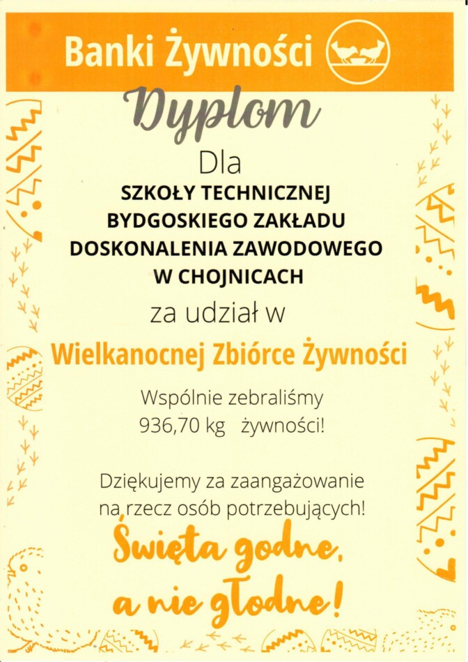 1 i 2 kwietnia 2022 r. braliśmy udział w Wielkanocnej Zbiórce Żywności organizowanej przez Chojnicki Bank Żywności. W akcję zaangażowali się nasi uczniowie: Filip Guziński, Łukasz Kowalski, Eryk Kromer oraz Wiktor Ryng. Opiekunem był Pan Sławomir Maniawski.