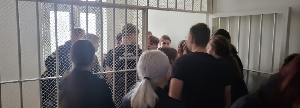 Ponadto podczas wizyty w chojnickim sądzie uczniowie mieli okazję być w pomieszczeniu przeznaczonym dla osób pozbawionych wolności dowożonych na rozprawy z zakładów karnych lub aresztów śledczych. Mogli również zasiąść za stołem sędziowskim, na ławach oskarżonego czy obrońców.
