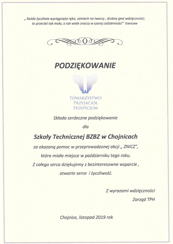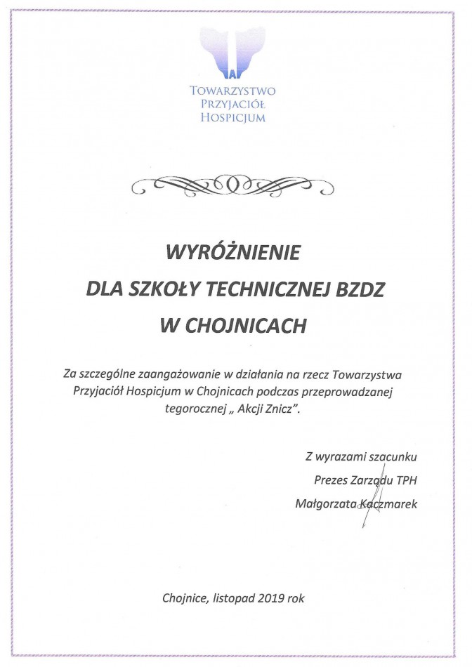 Wyróżnienie i Podziękowanie od Towarzystwa Przyjaciół Hospicjum dla Szkoły Technicznej BZDZ w Chojnicach