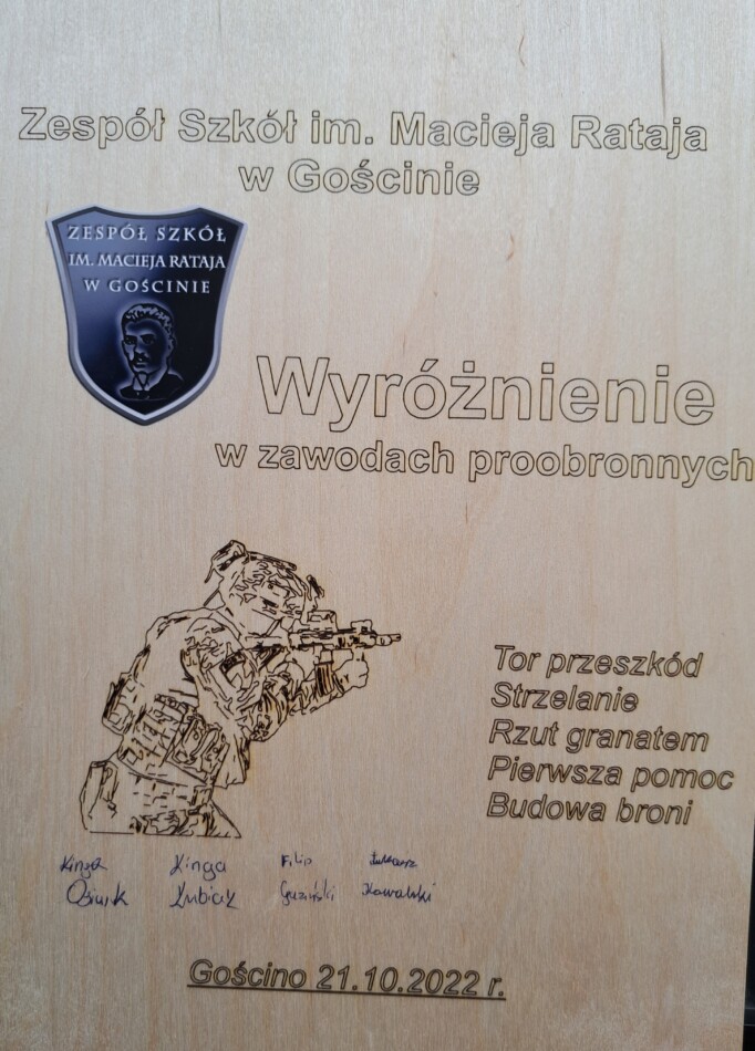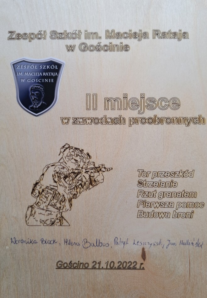 W ubiegły piątek uczniowie klas mundurowych BZDZ Chojnice brali udział w zawodach proobronnych zorganizowanych przez Zespół Szkół im. Macieja Rataja w Gościnie. W zawodach udział wzięły drużyny z powiatu kołobrzeskiego i chojnickiego. Celem zawodów było wyłonienie najlepszego zawodnika oraz popularyzacja strzelectwa sportowego. Uczestnicy rywalizowali w konkurencjach strzelania z karabinka pneumatycznego, transport rannego na noszach, rzut granatem, tor przeszkód oraz test wiedzy. Uczniowie zdobyli II, III miejsce oraz wyróżnienie. Gratulujemy zawodnikom i życzymy kolejnych sukcesów.