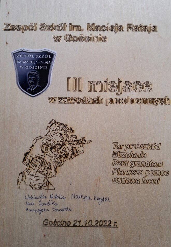 W ubiegły piątek uczniowie klas mundurowych BZDZ Chojnice brali udział w zawodach proobronnych zorganizowanych przez Zespół Szkół im. Macieja Rataja w Gościnie. W zawodach udział wzięły drużyny z powiatu kołobrzeskiego i chojnickiego. Celem zawodów było wyłonienie najlepszego zawodnika oraz popularyzacja strzelectwa sportowego. Uczestnicy rywalizowali w konkurencjach strzelania z karabinka pneumatycznego, transport rannego na noszach, rzut granatem, tor przeszkód oraz test wiedzy. Uczniowie zdobyli II, III miejsce oraz wyróżnienie. Gratulujemy zawodnikom i życzymy kolejnych sukcesów.