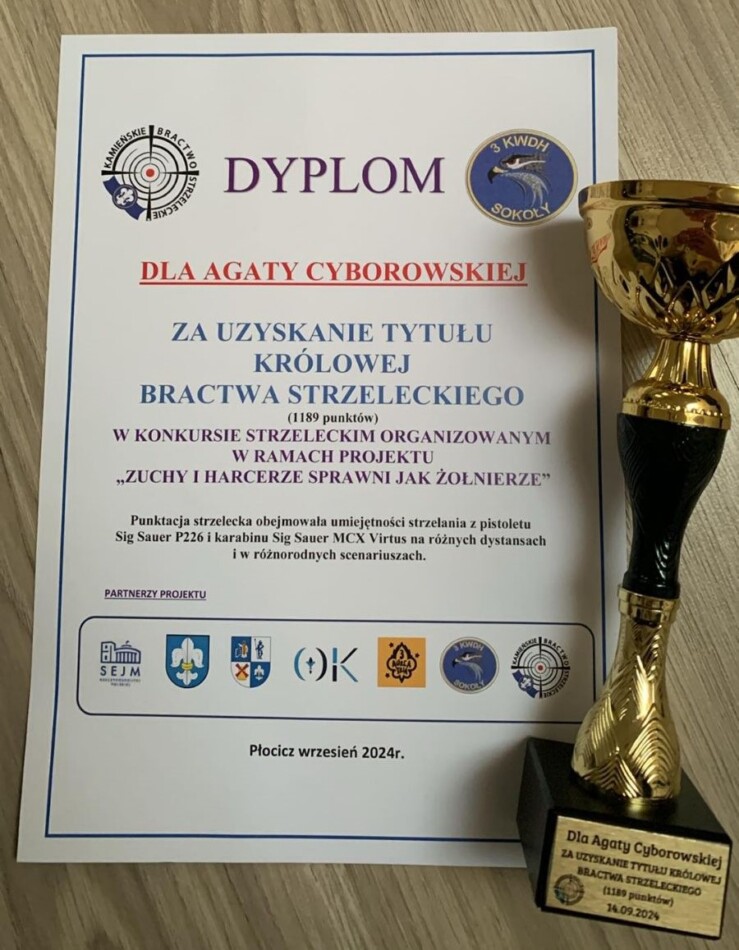 Uczennica klasy IIc Agata Cyborowska zwyciężyła w konkursie strzeleckim ” Zuchy i Harcerze sprawni jak Żołnierze ” , Którego organizatorem było Kamieńskie Bractwo Strzeleckie i 3 Kamieńska Wielopoziomowa Drużyna Harcerska ” Sokoły .” Konkurs odbył się 14.09 i obejmował osiem serii strzelań z pistoletu i karabinka pneumatycznego. Agata w trudnej rywalizacji pokonała 19 startujących rywalek i rywali. Gratulujemy !