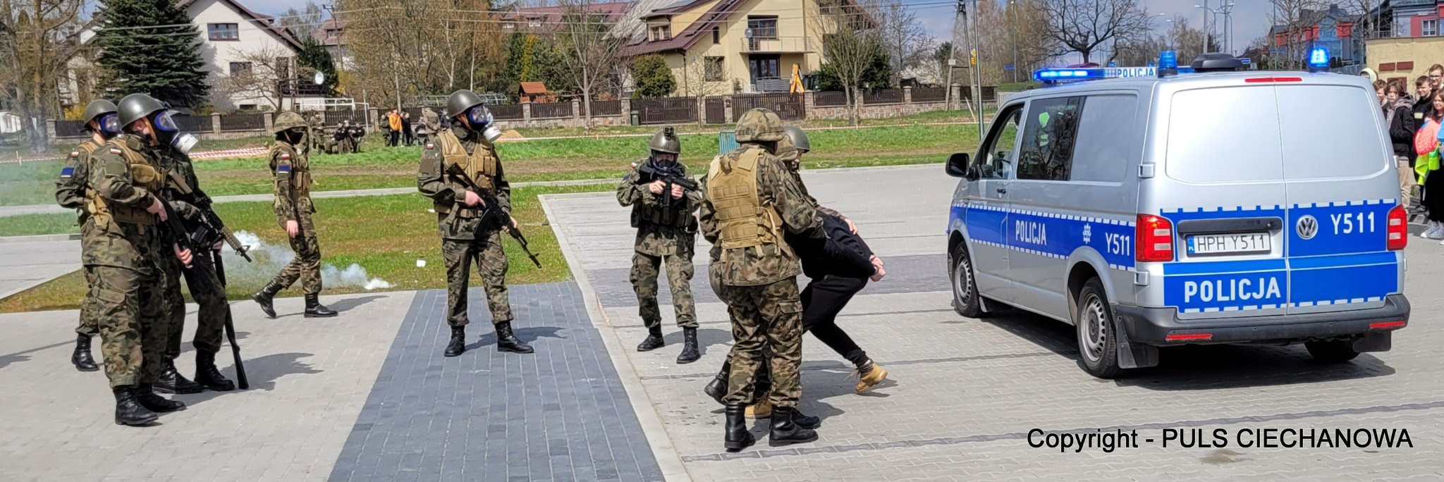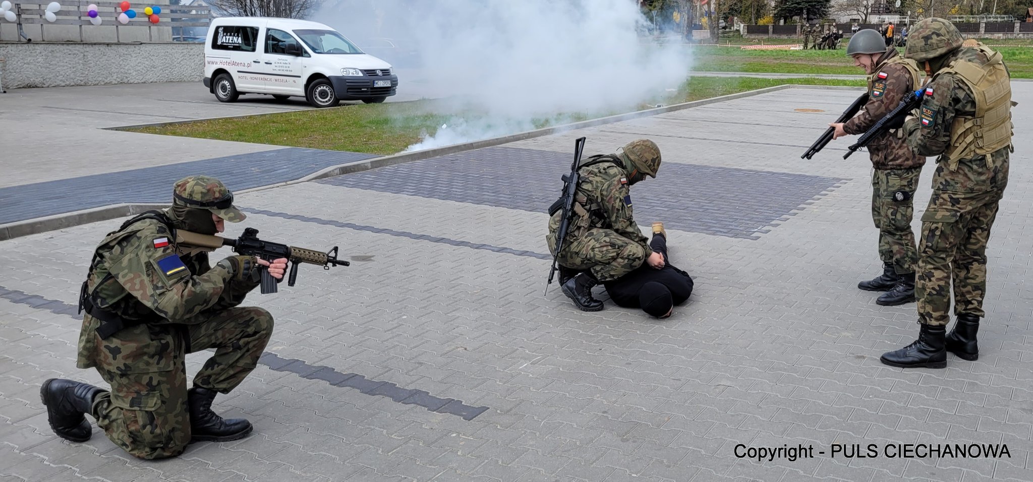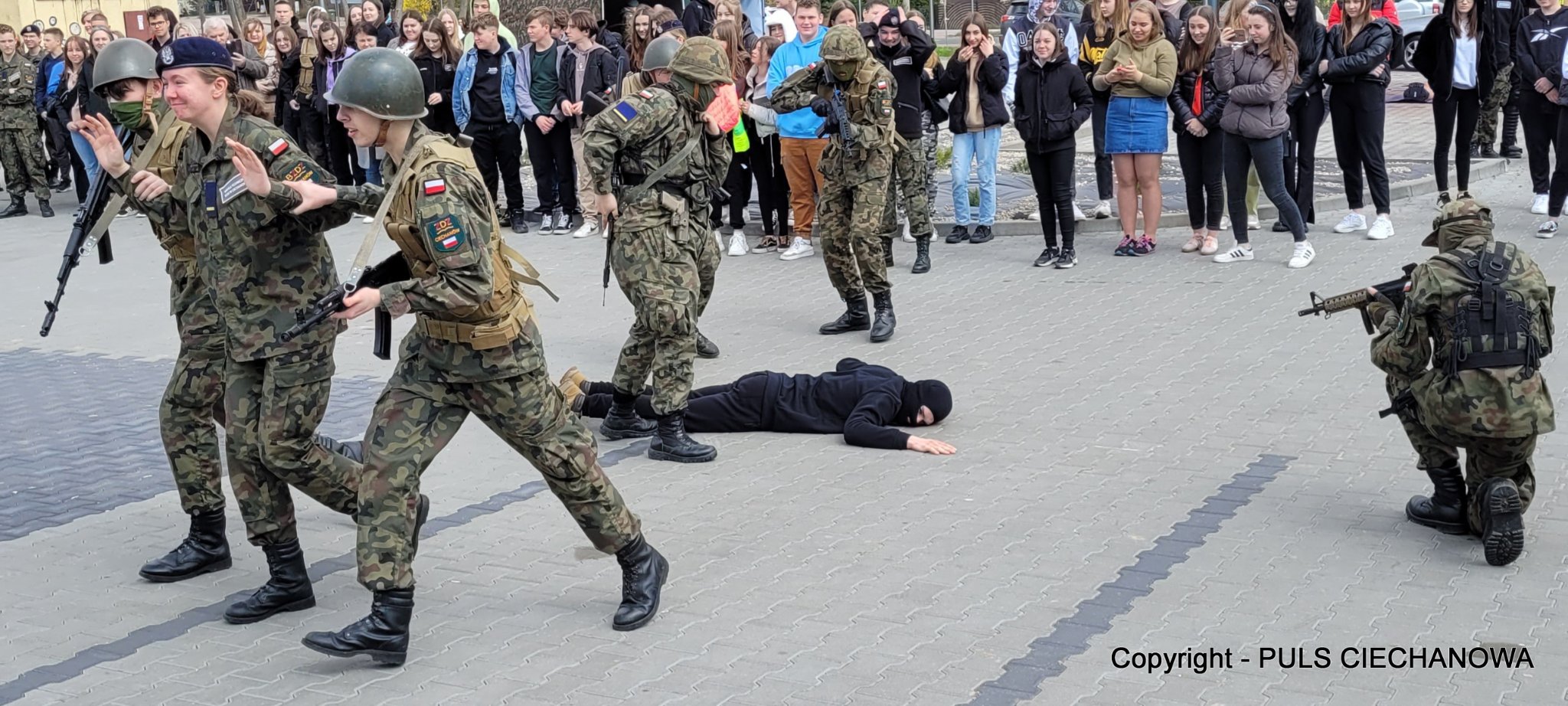 Szczególnie widowiskowo wyglądały pokazy przygotowane przez uczniów klas mundurowych. Akcja odbicia zakładnika, ujęcie terrorysty, przeszukanie auta czy przekazanie zatrzymanego w ręce Policji – wyglądały niemalże jak z filmów akcji. Świetnie zaprezentowali się uczniowie fakultetów: wojskowego pod kierunkiem sierż. Pauliny Królikowskiej (2. Ośrodek Radioelektroniczny w Przasnyszu) oraz policyjnego pod kierunkiem mł. asp. Magdy Zarembskiej (Komenda Powiatowa Policji w Ciechanowie).