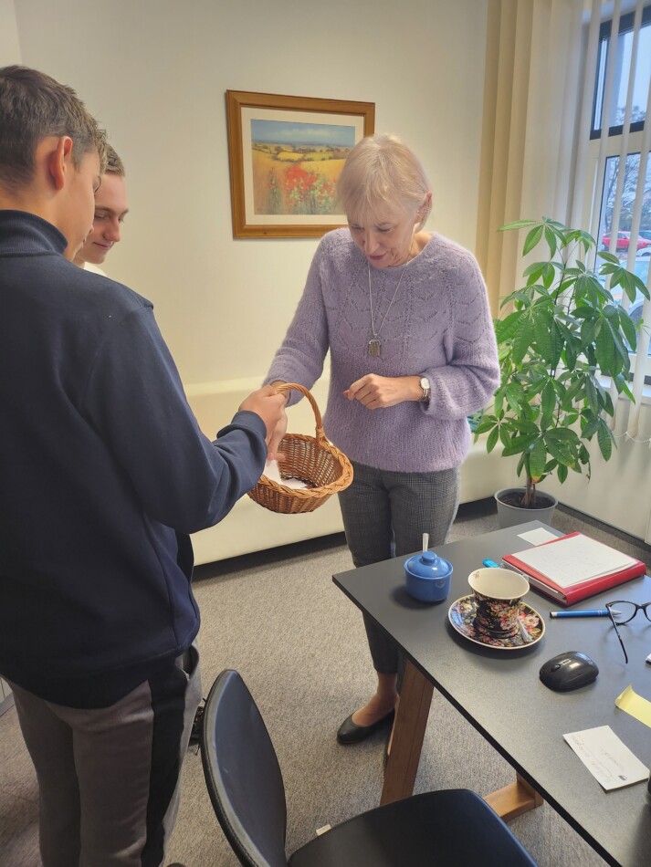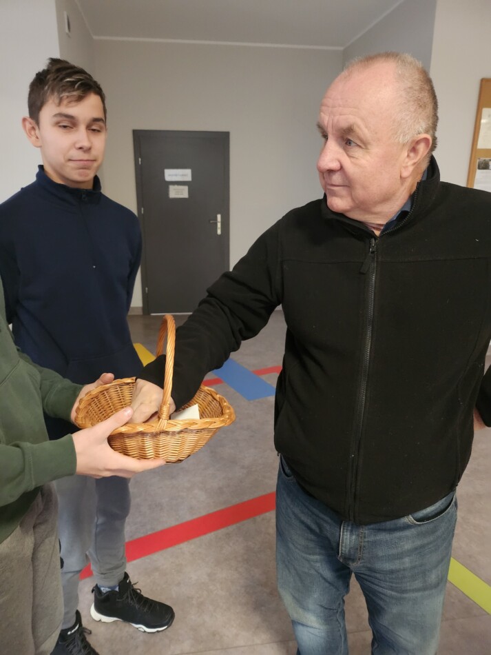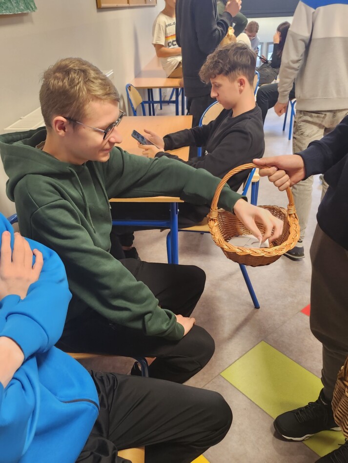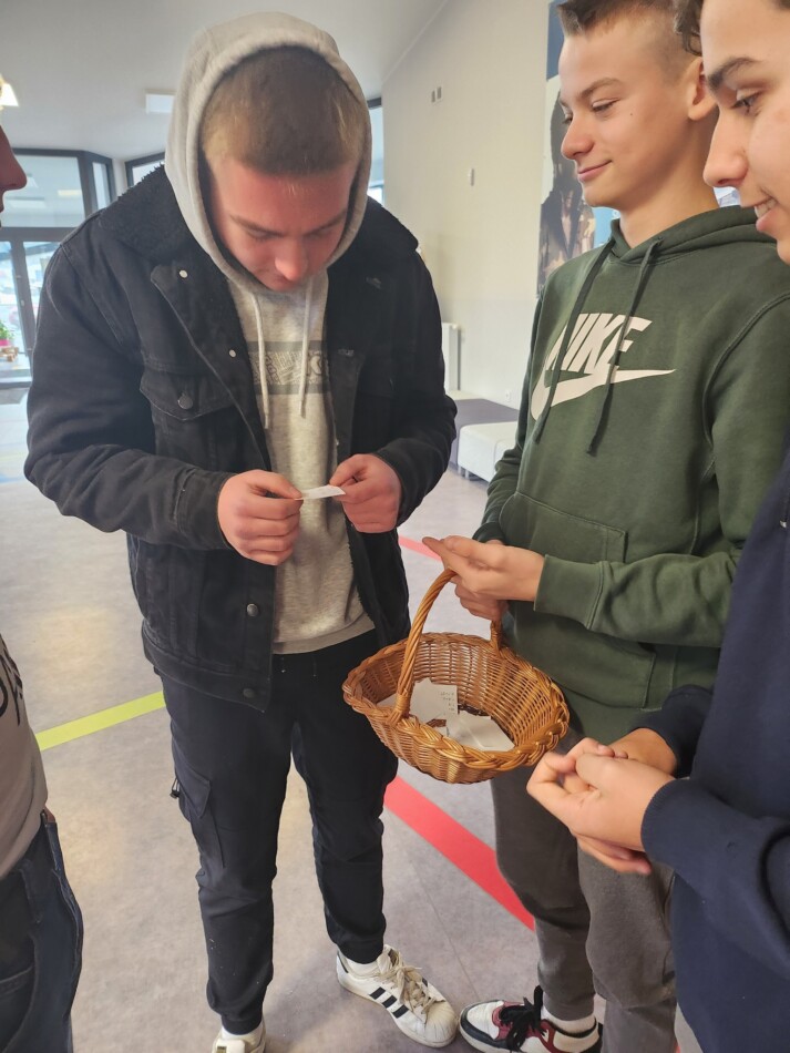 Uczniowie kl. 1 Ta wcielili się w rolę egzaminatorów z tabliczki mnożenia. Każda, osoba, która poprawnie udzieliła odpowiedzi na pytania z wyciągniętego losu otrzymała słodki upominek.