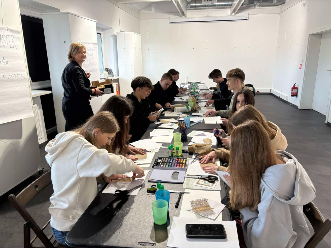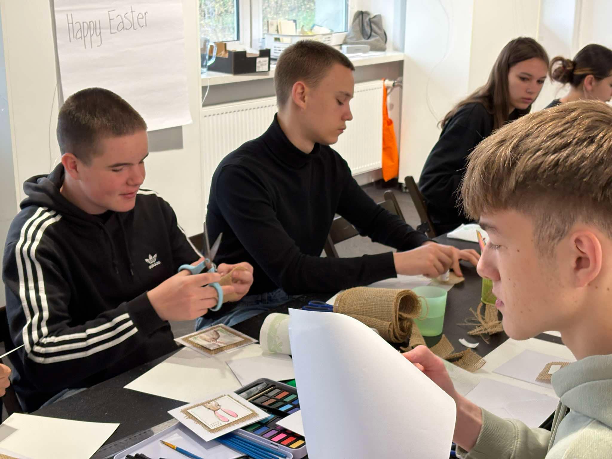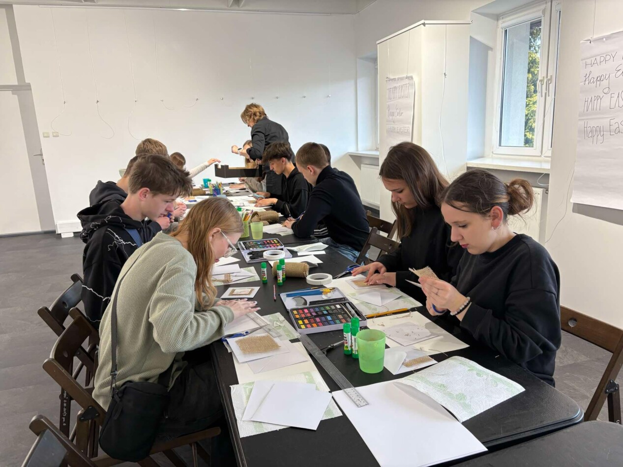 1b odwiedziła Domek na Wodzie, gdzie pod czujnym okiem Pani Urszuli Cecylii Michalskiej tworzyli wielkanocne kartki pocztowe .