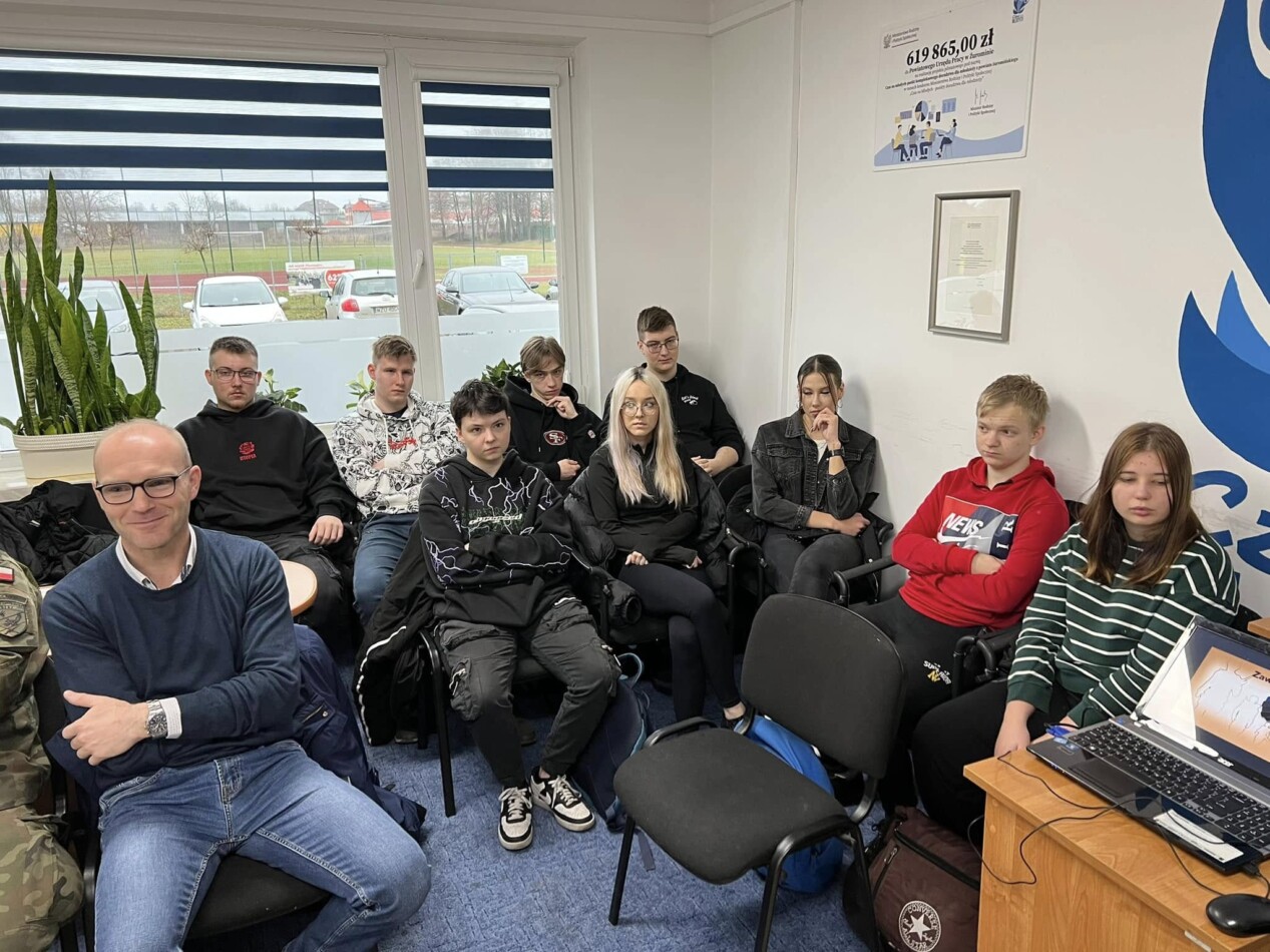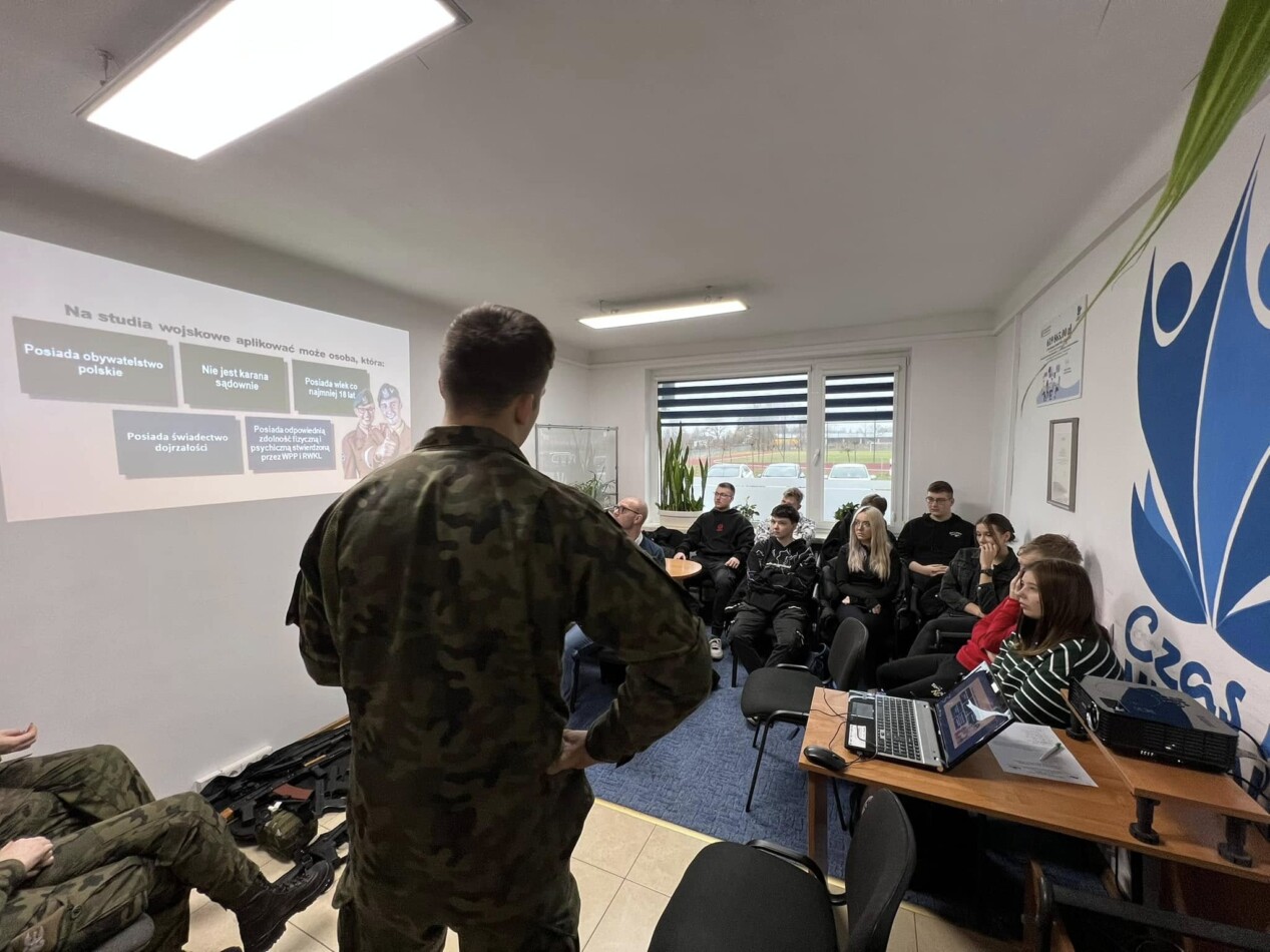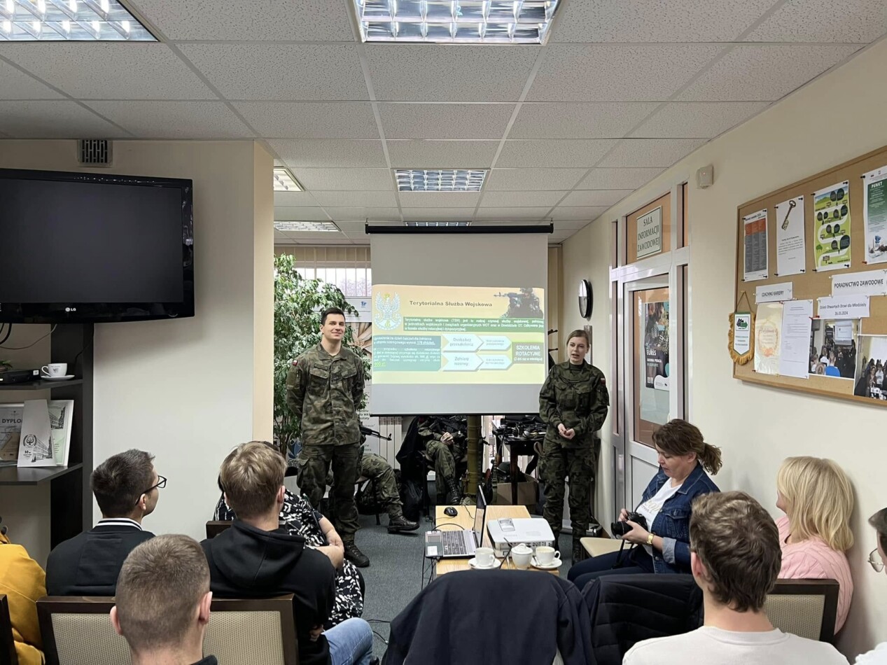 Kadeci Maja Konopska i Karol Kwiatkowski pomagali przedstawicielom WCR w Ciechanowie w prowadzeniu zajęć dotyczących ochotniczych rodzajów służby wojskowej podczas spotkania z młodzieżą w Powiatowym Urzędzie Pracy w Żurominie.